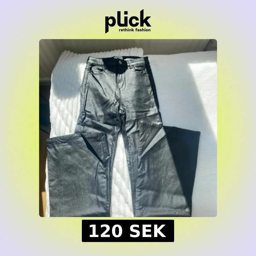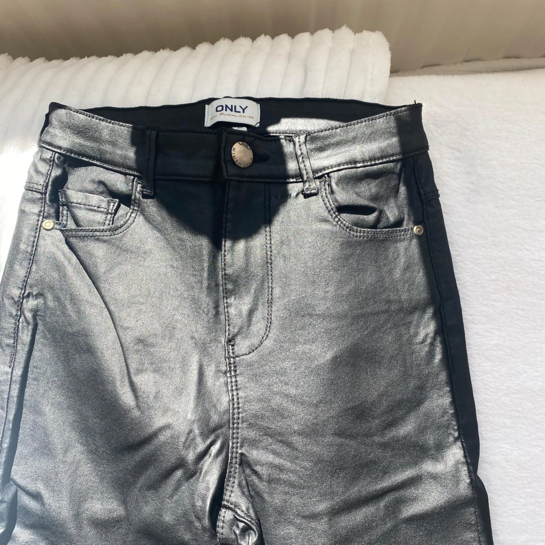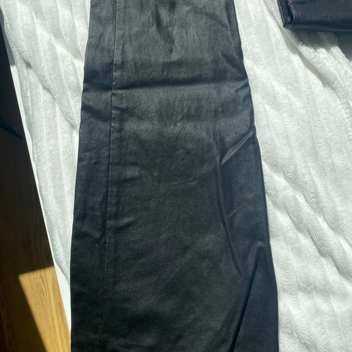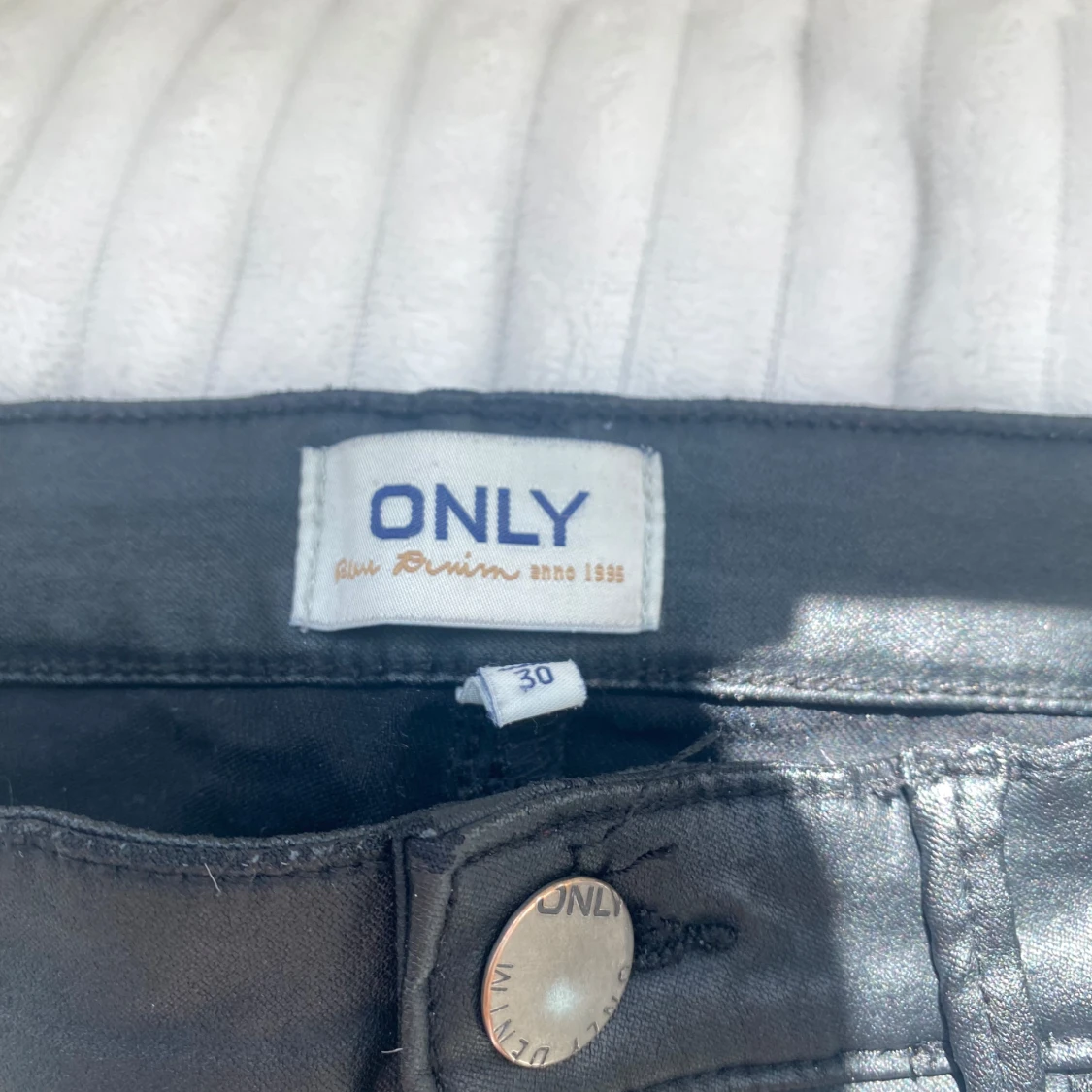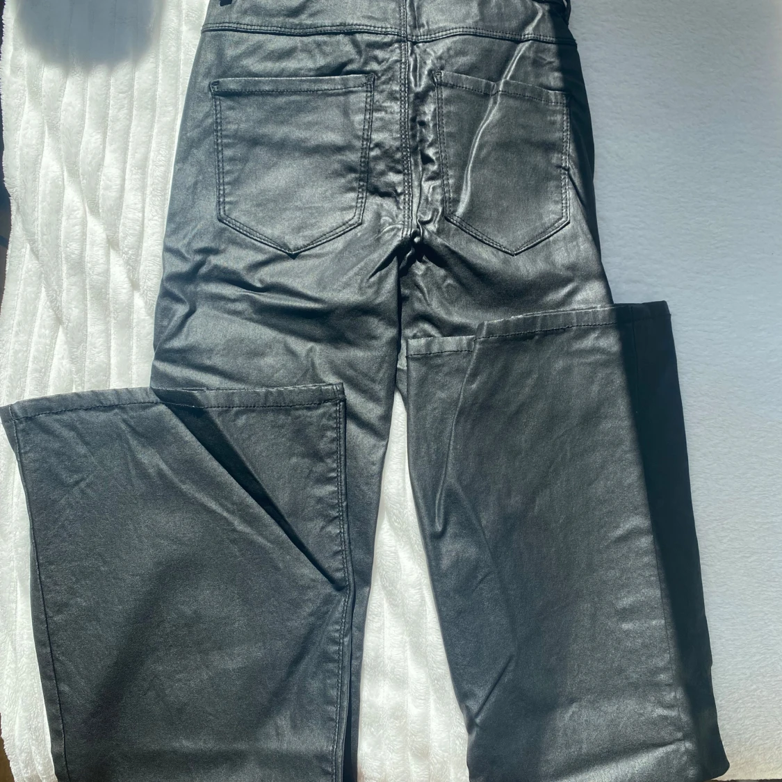 Snygga svarta skinn byxor från ONLY med fem fickor och utsvängda ben. Byxorna har en glansig finish som ger en cool look och är perfekta för dig som vill sticka ut. Klassisk knapp och dragkedja framtill samt bälteshällor i midjan.