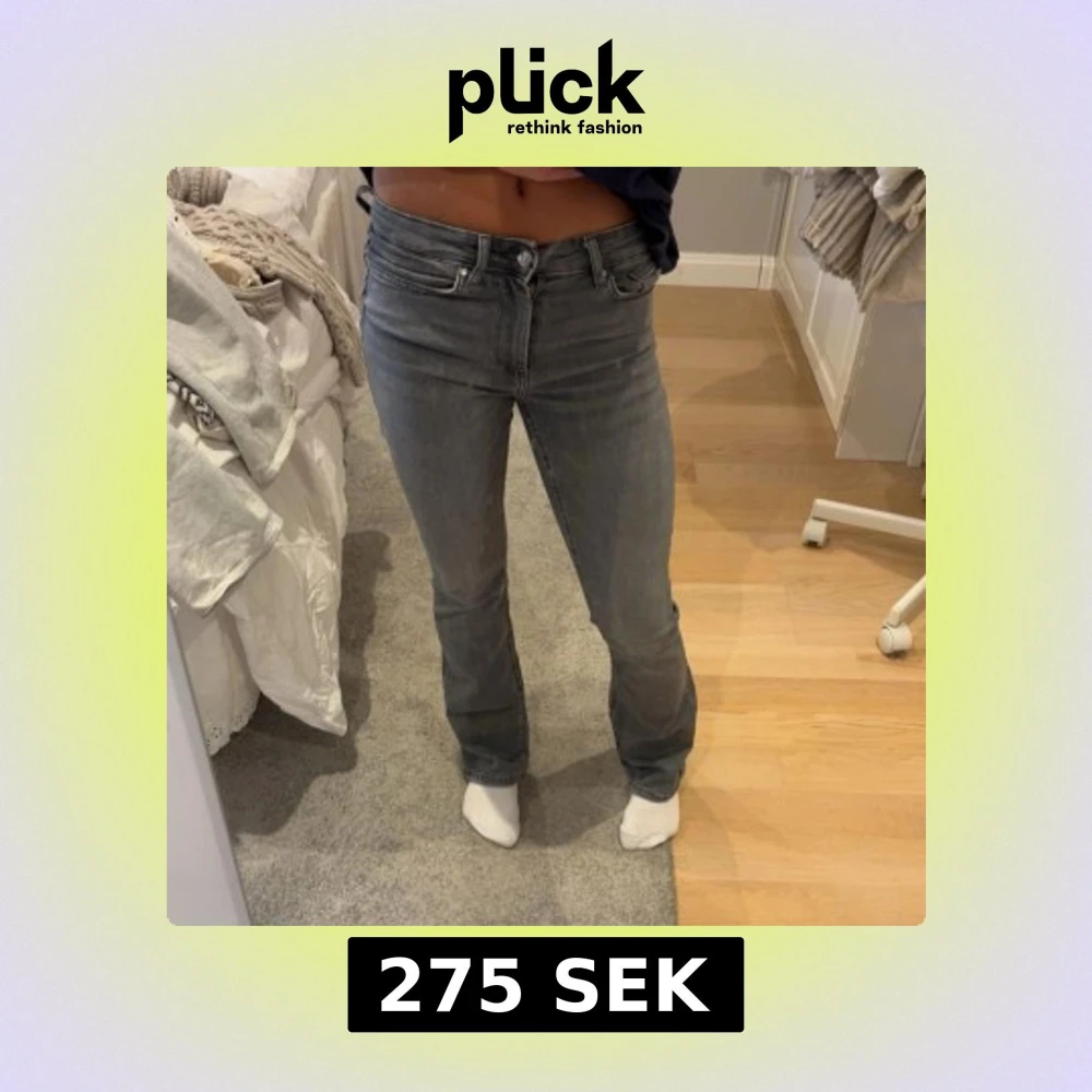grå jeans från ONLY med bootcut passform och klassisk femficksdesign. Jeansen har en högre midja och raka ben med lätt utsvängning nedtill. Materialet är mjukt och stretchigt denim.💗