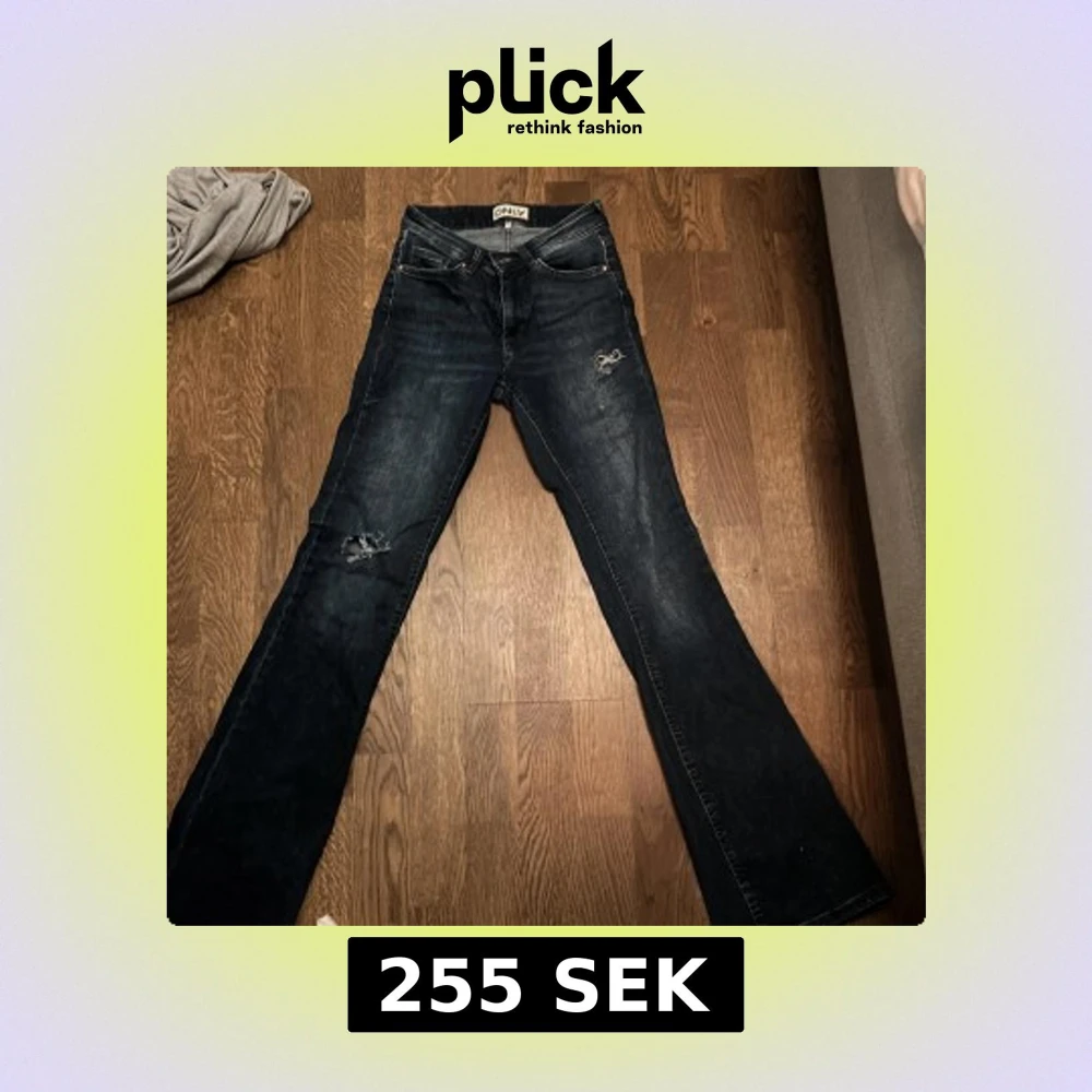 Mörkblå bootcut jeans från ONLY med slitna detaljer på låret och knät, skulle säga att dom är mid Waist så inte lowwaist🥰är inte så använda. Har gjort hålen själv.