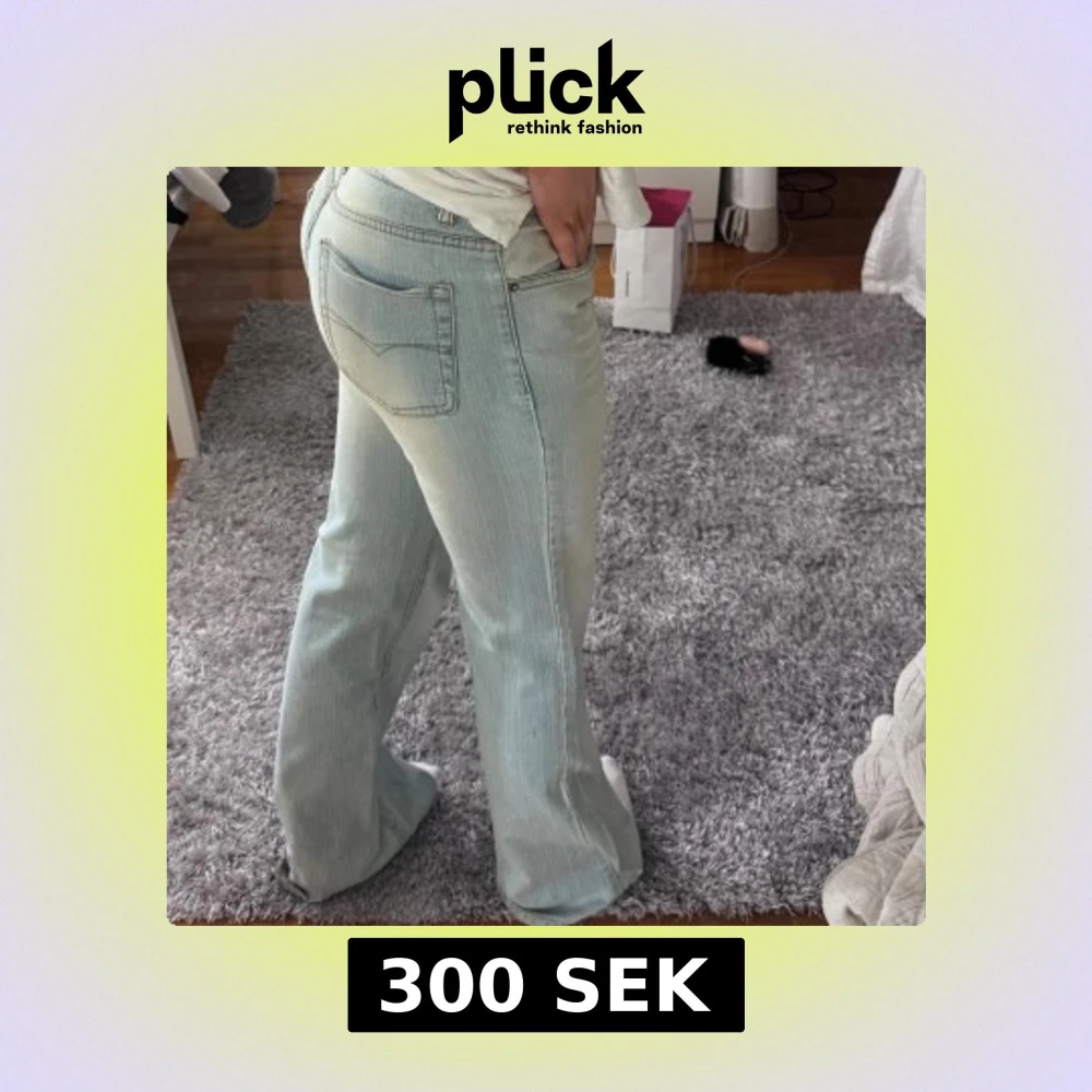 Säljer ett par ljusblå jeans med bootcut passform och klassiska fickor bak. Jeansen har en lätt tvättad look och är tillverkade i mjukt denimtyg. Perfekta för dig som gillar en avslappnad och trendig stil. Köpta second hand men inte använt dessa!! Finns ett jätte litet hål vid höger knä (se sista bild) men går säkert att sy ihop!