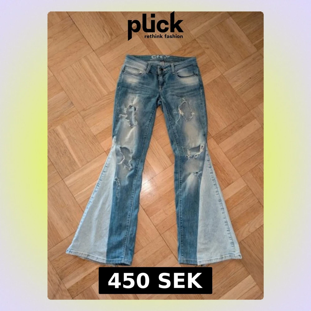Säljer ett par blå bootcut vintage only jeans utsydda till bootcut och har hål på låren. Jeansen har låg midja och är tillverkade i denim med kontrasterande ljusare paneler nedtill. Riktigt snygga och unika jeans för dig som gillar en edgy stil.