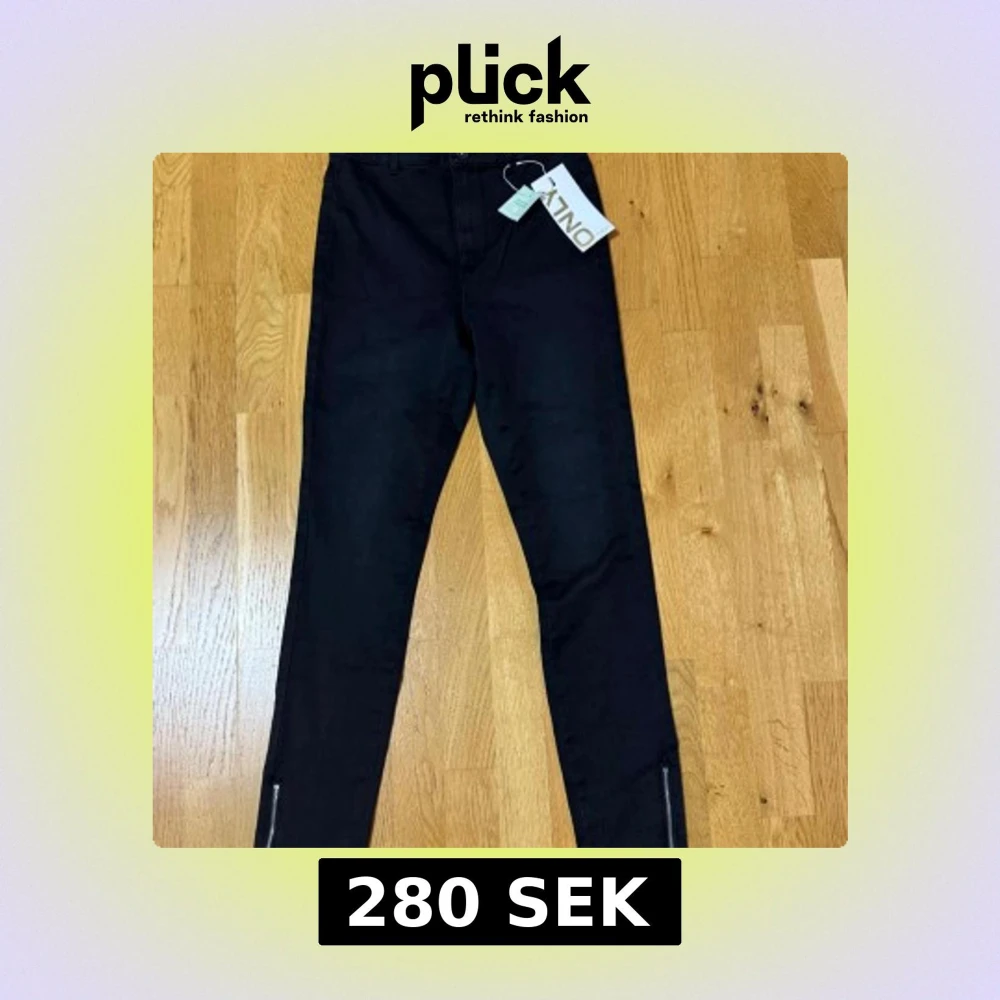 Svarta skinny jeans från ONLY med dragkedjedetaljer vid bensluten. Klassisk femficksmodell med knapp och dragkedja i midjan. Snygg passform som sitter tight hela vägen ner. Aldrig använda pga köpt i fel storlek.