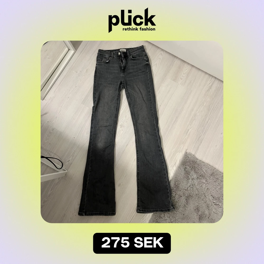 Säljer ett par snygga grå bootcut jeans från ONLY i storlek S. De har en klassisk femficksdesign och är i mycket bra skick. Perfekta för både vardag och fest! 🖤