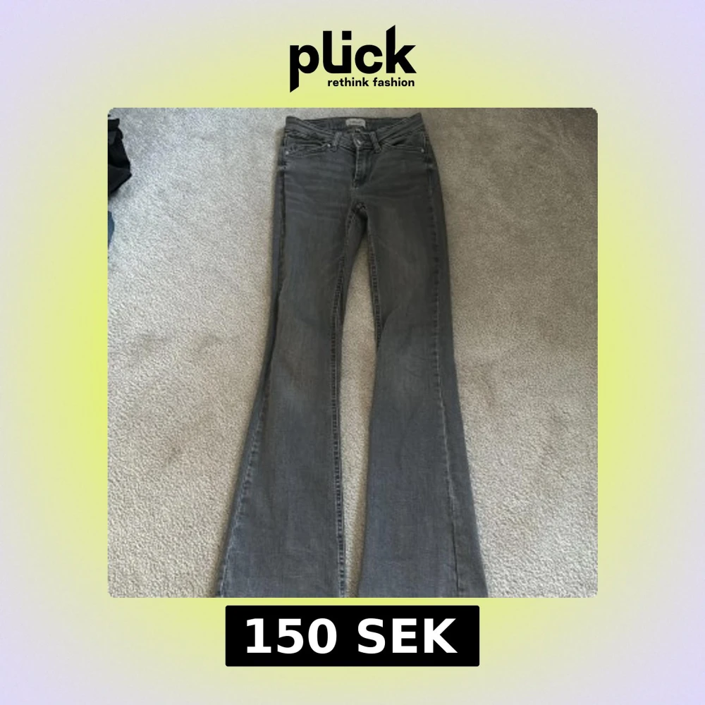 Säljer ett par gråa bootcut jeans från ONLY i storlek XS. Jeansen har klassisk femficksdesign, normal passform upptill och utsvängda ben. Tillverkade i denim med knapp och dragkedja framtill.