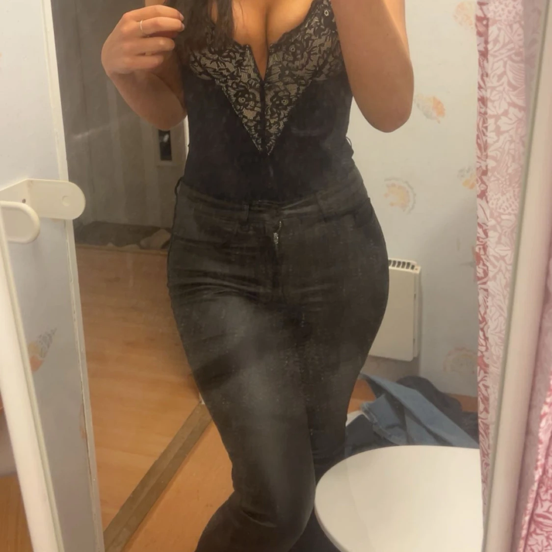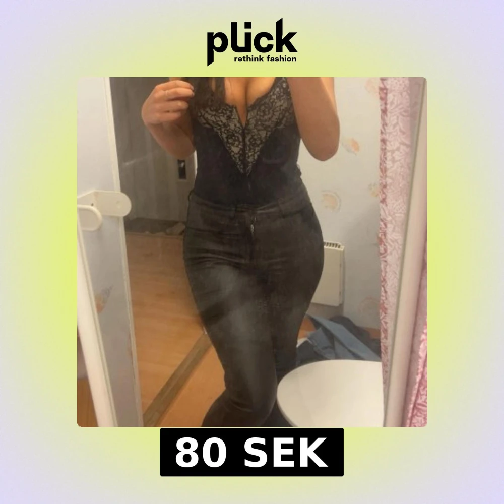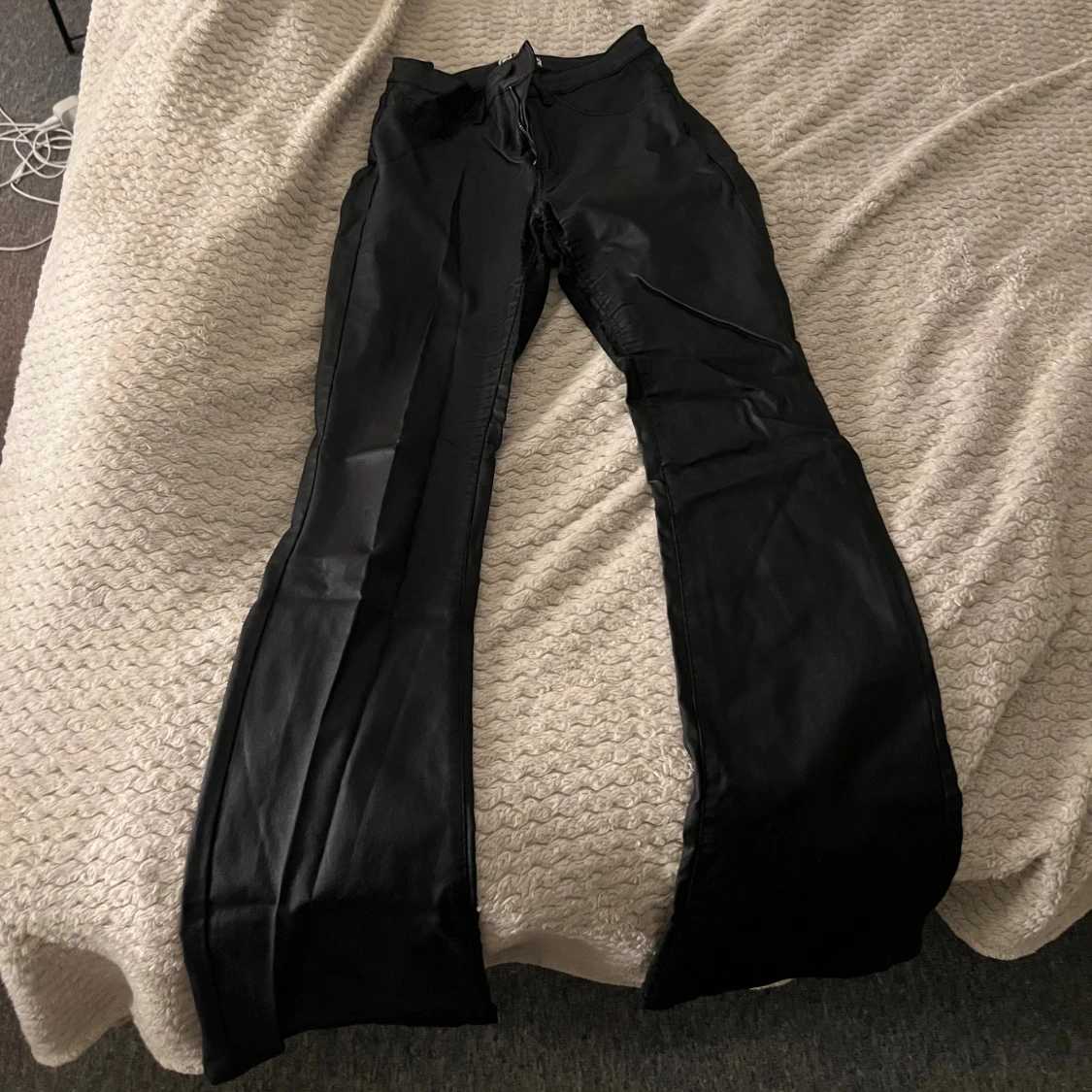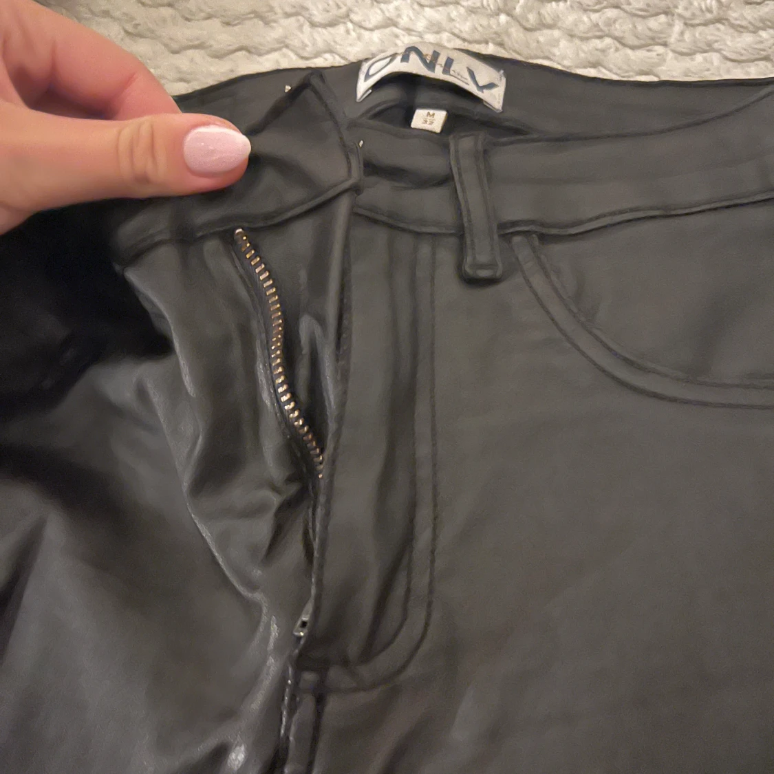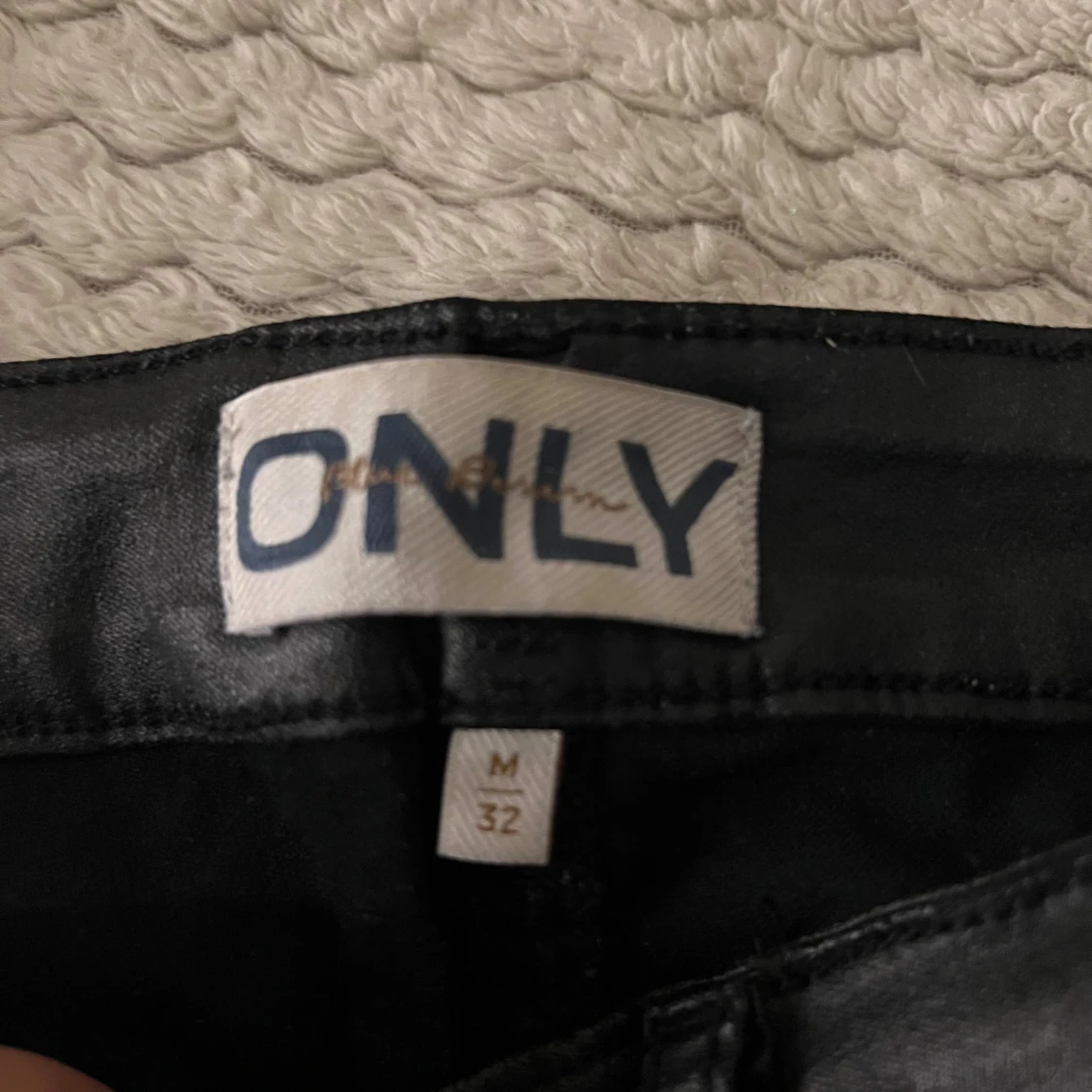 Säljer ett par svarta bootcut-byxor från ONLY i storlek M/32. Byxorna är i nån slags läder form
