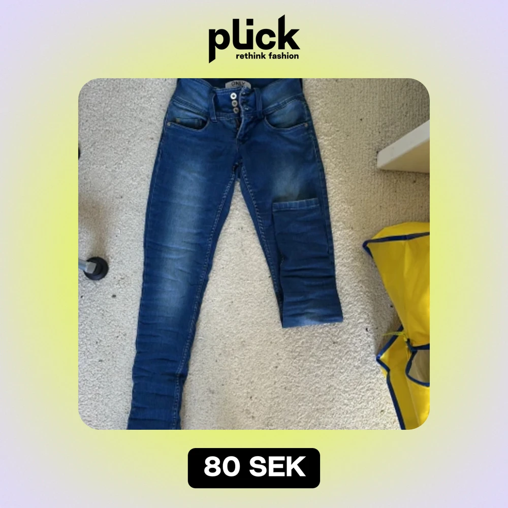 Säljer ett par snygga blå jeans från ONLY. De är i storlek Waist 27 och Length 32. Jeansen har en låg midja och är skinny fit. De har en dragkedja och tre knappar framtill. Perfekta för både vardag och fest!