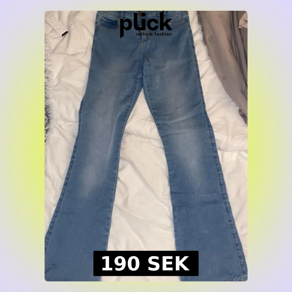 Säljer ett par ljusblå bootcut jeans med klassisk femficksdesign och knappgylf. Jeansen har en snygg utsvängd passform från knät och är tillverkade i mjukt denimtyg.