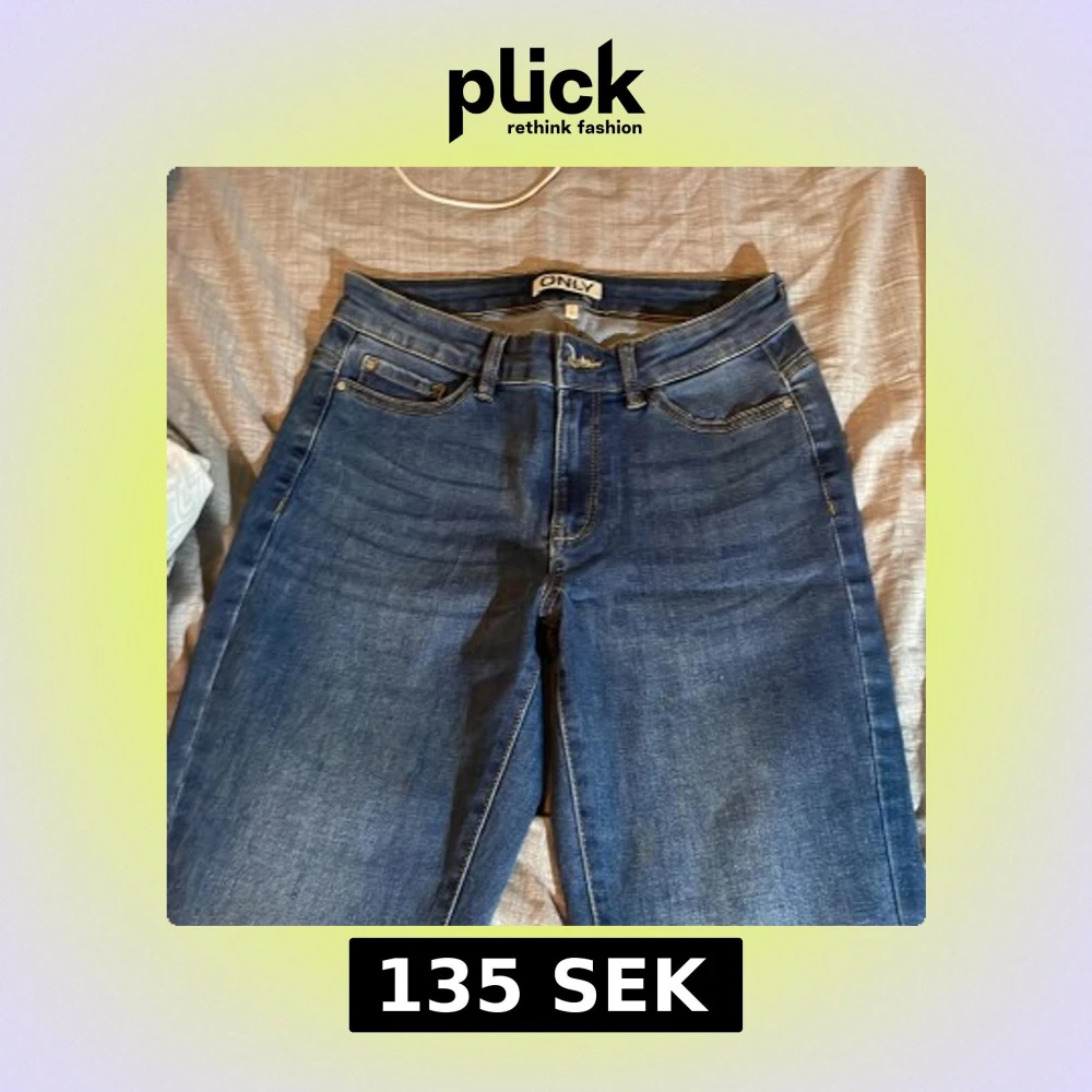 Säljer ett par klassiska blå jeans från ONLY i storlek S/34. Byxorna har fem fickor, normal passform och raka ben. Perfekta till vardags och enkla att matcha med olika stilar. Snygga detaljer med kontrastsömmar och bälteshällor. Dem är hög midjade