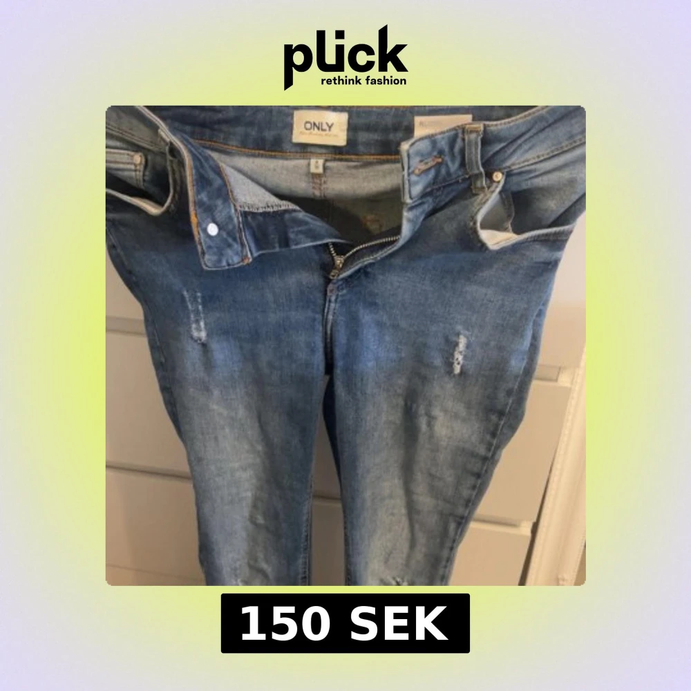 Snygga blå jeans från ONLY med skinny passform och slitna detaljer på benen. Jeansen har klassisk femficksdesign, dragkedja och knapp framtill. Perfekt för dig som gillar en smal siluett och lite tuffare look.