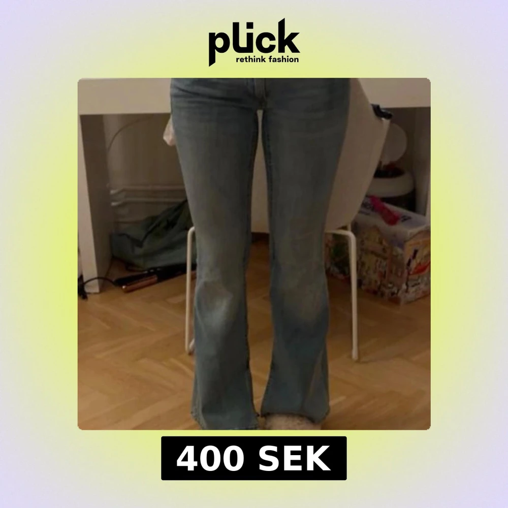 Säljer ett par blå jeans med bootcut-modell och låg midja. Jeansen har klassisk femficksdesign och är tillverkade i denim. Perfekta för dig som gillar en avslappnad och trendig look.