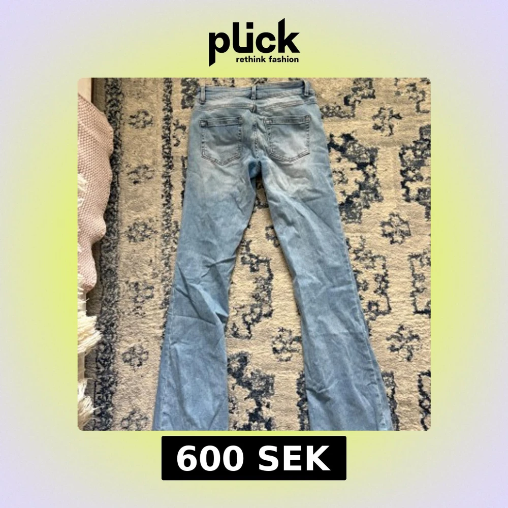 Säljer ett par ljusblå jeans från ONLY med klassisk femficksdesign och snygg bootcut-passform. Jeansen har låg midja, dragkedja och knapp framtill samt bälteshällor. Perfekta för dig som gillar en retro vibe och vill ha ett par jeans som sticker ut. Passar bra på mig som är 174