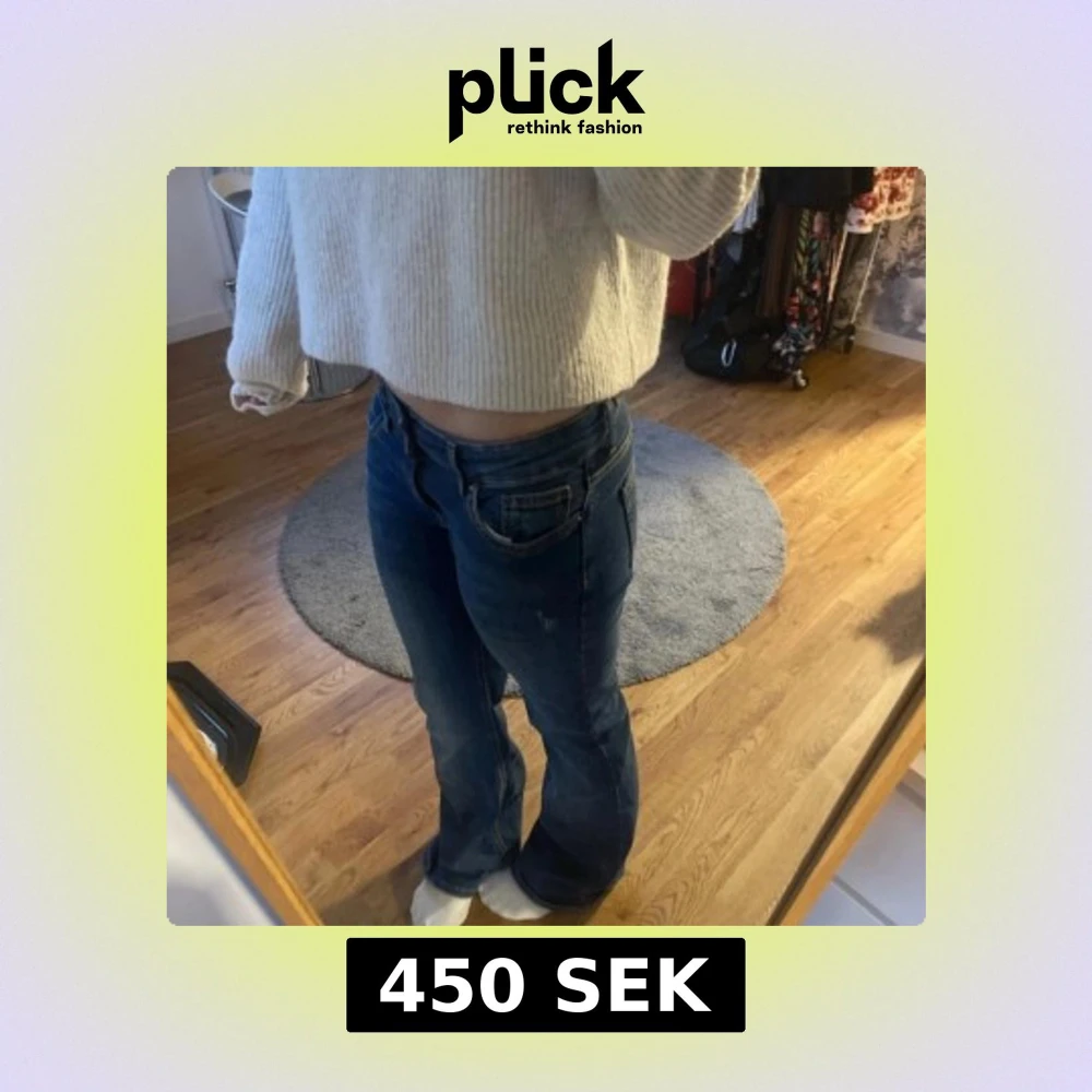 Snygga blå jeans med låg midja och utsvängd passform. Använda men inte alls mycket. Nypris är 530
