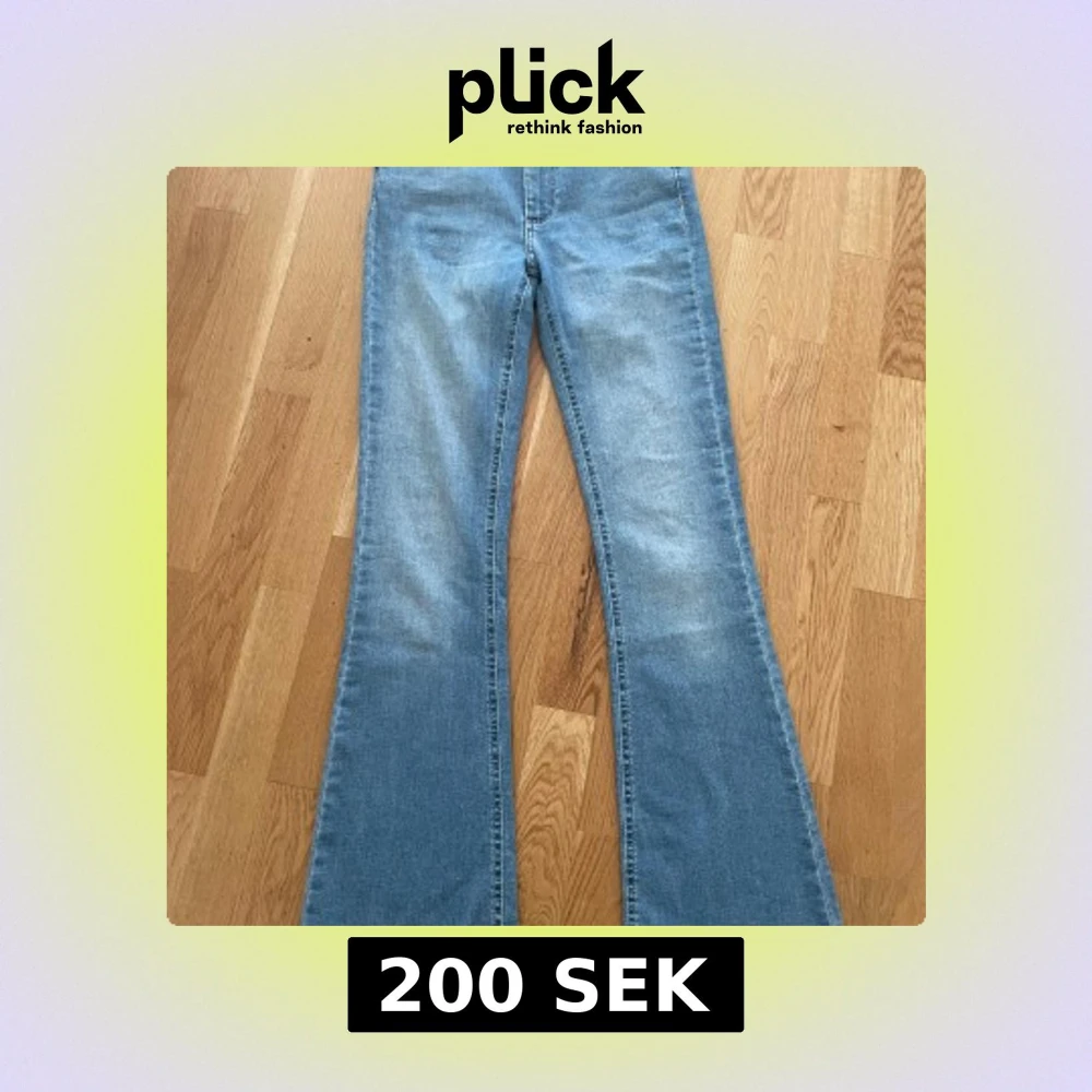 Säljer ett par ljusblå jeans med klassisk bootcut-modell. Jeansen har normal midja och är tillverkade i mjukt denimtyg. De har två bakfickor och en snygg, utsvängd passform nertill.