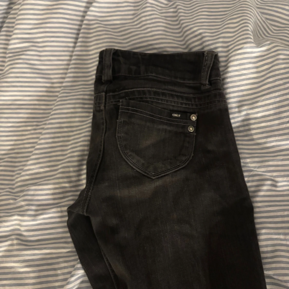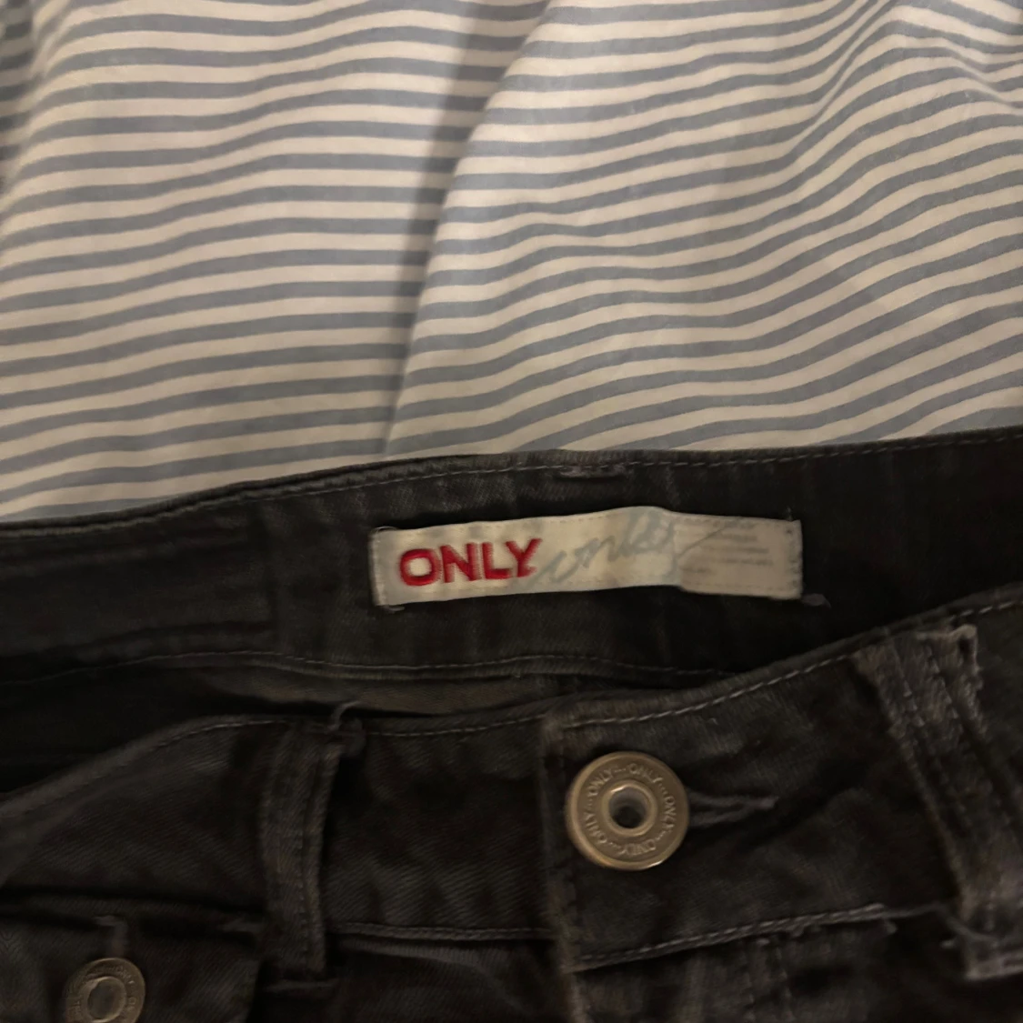 Svarta jeans från ONLY med raka ben och klassiska femficksdetaljer. Jeansen har snygga sömmar, silverfärgade knappar och en diskret tvättad look. Perfekta för dig som gillar en enkel och stilren vibe. Storlek 27