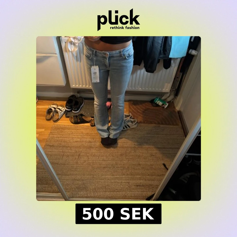 Säljer ett par ljusblå jeans med bootcut-modell och låg midja. Storlek s längd 34
