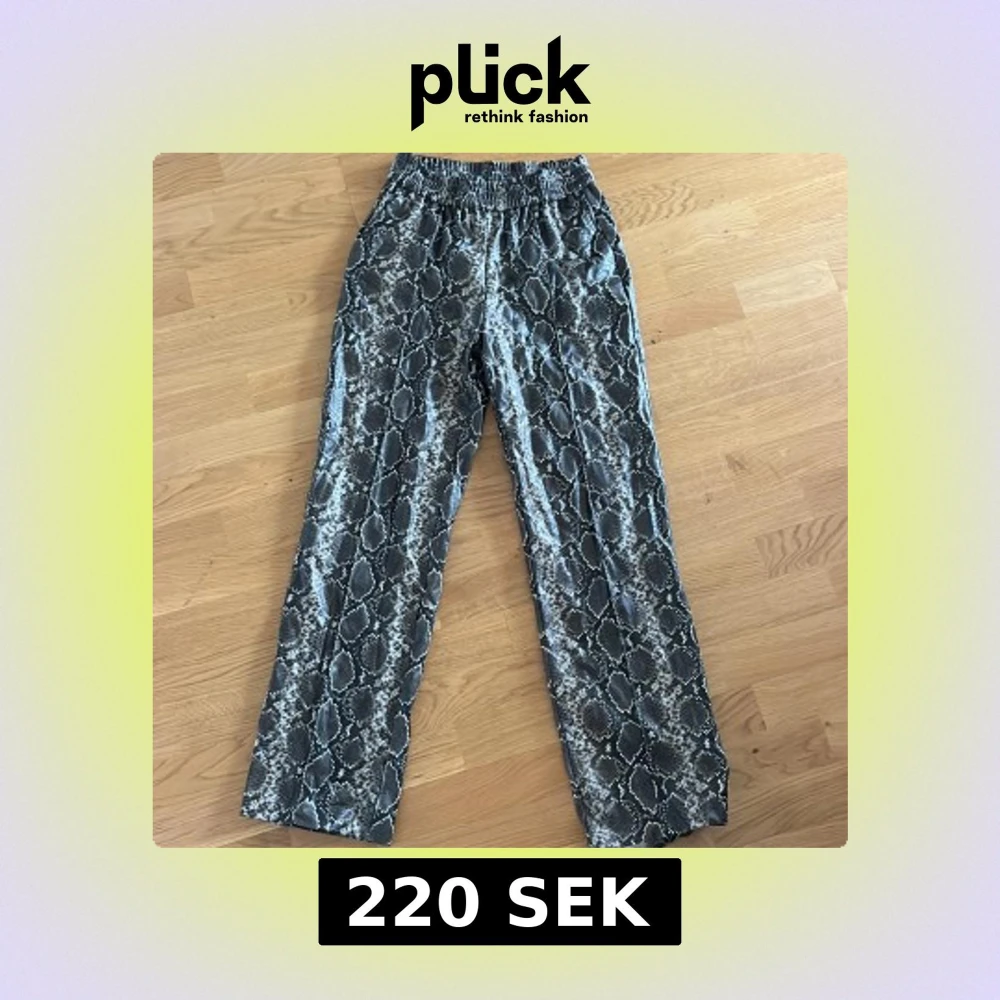 Säljer ett par svarta och grå byxor från ONLY med ormmönster. Byxorna har elastisk midja och raka ben för en chill och trendig look. Materialet är mjukt och lätt, perfekt för dig som vill sticka ut lite extra.