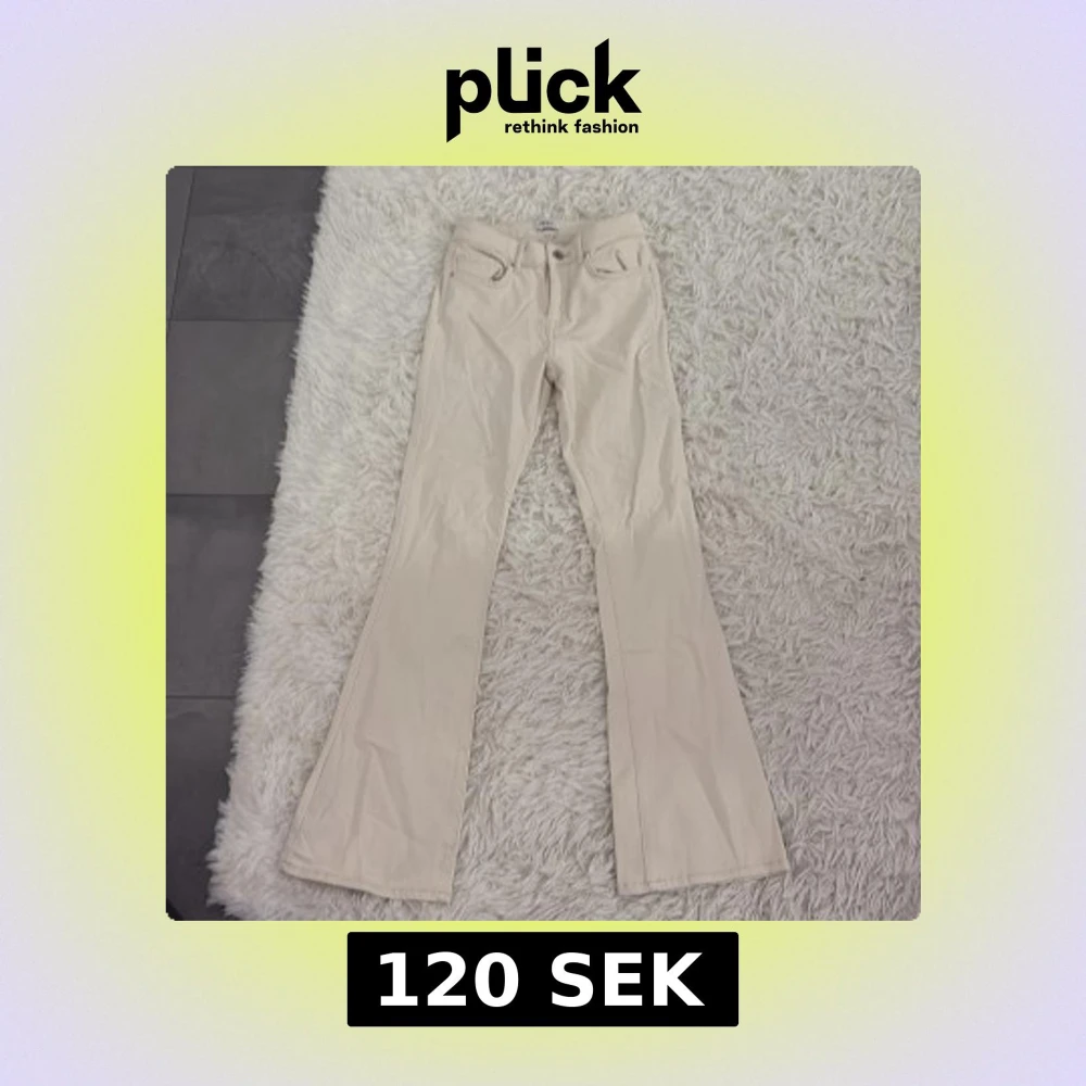 Snygga beige bootcut byxor. Perfekta för en stilren look och passar bra till olika tillfällen. De har en knapp och dragkedja framtill.