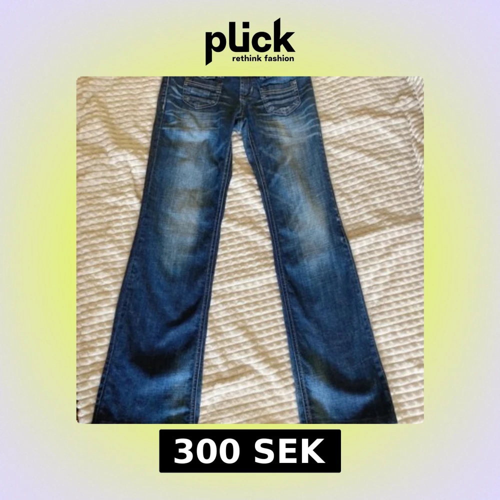 Snygga blå bootcut jeans från ONLY med klassisk femficksdesign och knappgylf. Perfekta för en avslappnad stil med en touch av vintage. Märkesdetaljer på bakfickorna och bältesslingor för extra stil. Midjemått 35 innerbenslängd 77cm