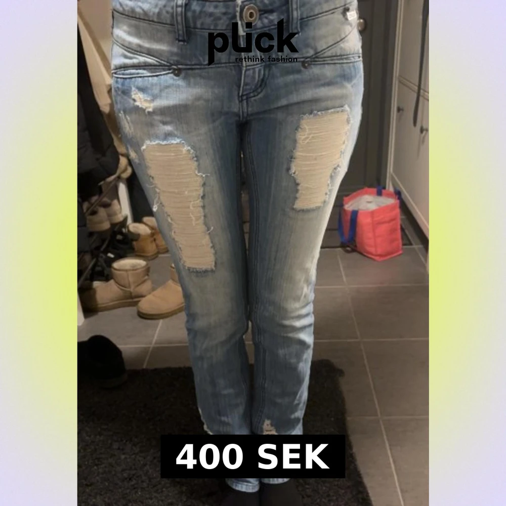 Säljer ett par ljusblå jeans från Only med snygga slitningar framtill och baktill. Jeansen har raka ben, klassisk femficksdesign och låg midja. Perfekta för dig som gillar en avslappnad och trendig look.