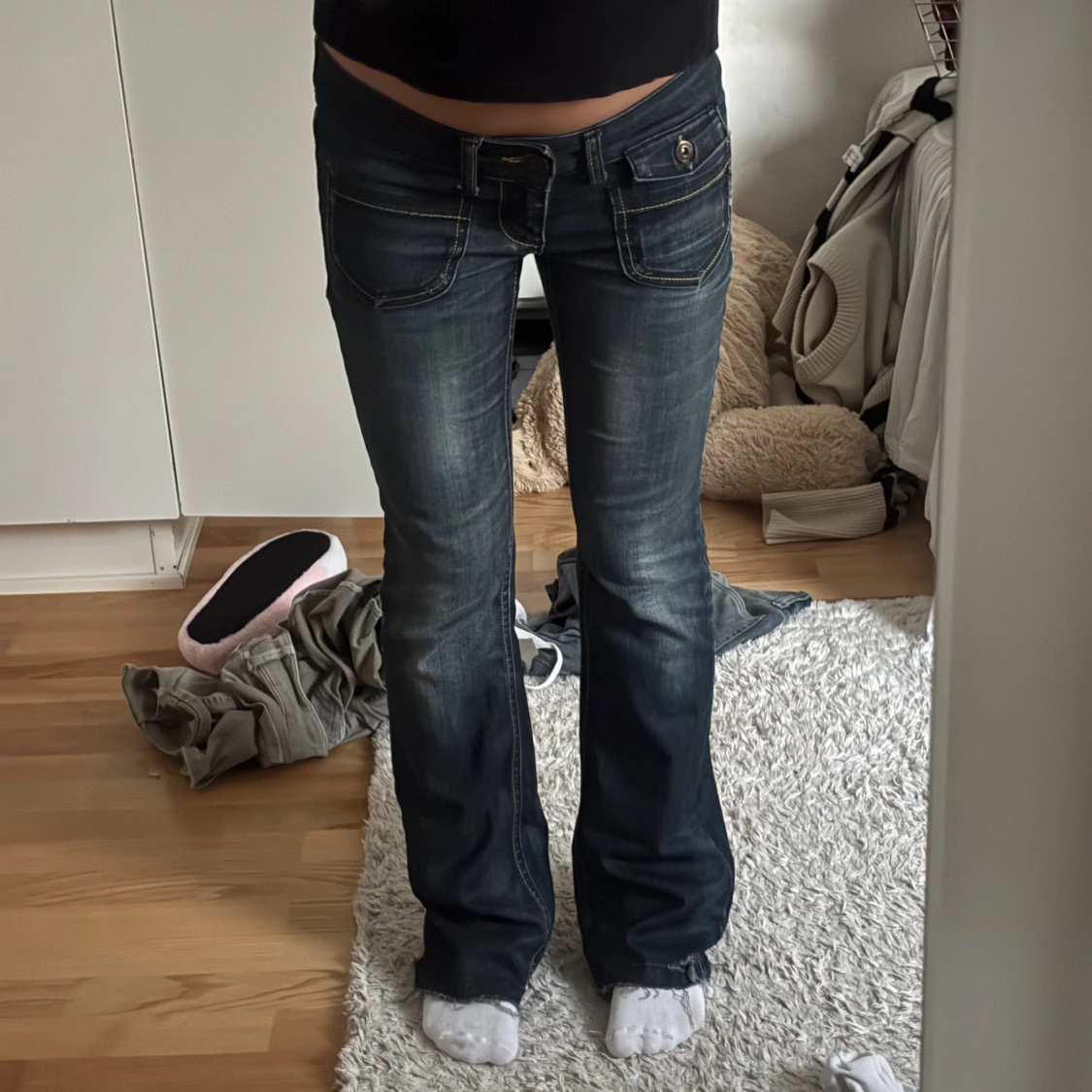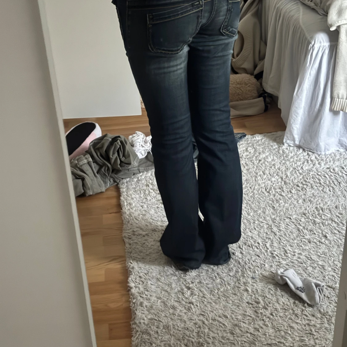Snygga mörkblå jeans med bootcut och låg midja. Jeansen har markerade sömmar, klassiska fickor fram och bak samt lätt slitna detaljer för en cool look. Perfekta för dig som gillar en retro vibe och vill ha ett par jeans som sticker ut. (lågmidjade) lite slitna längst ned. 34 midjemått. Passar perfekt för mig som är 166