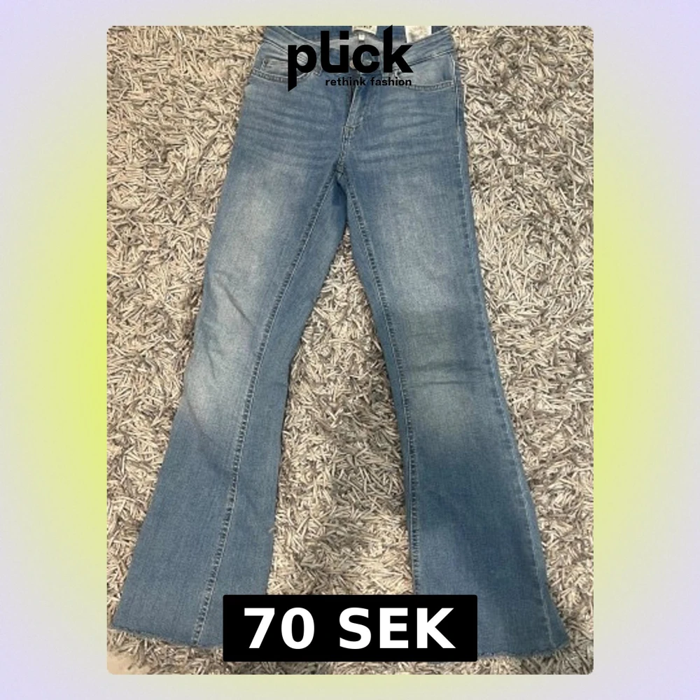 Säljer ett par ljusblå bootcut jeans från ONLY med klassisk femficksdesign och rå kant längst ner. Jeansen har låg midja och är tillverkade i mjukt denim-material med lätt tvättad look. Storlek xs/30 passar någon under 160 cm lång