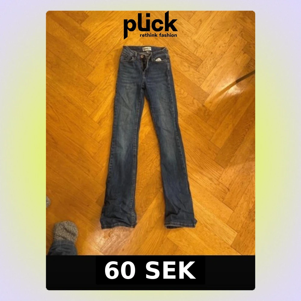 Säljer ett par blå jeans från ONLY i klassisk bootcut-modell. Jeansen har normal passform, fem fickor och dragkedja med knapp framtill. Materialet är jeans med snygga sömmar och detaljer. Perfekt för dig som gillar en tidlös look med lite extra sväng på benen.
