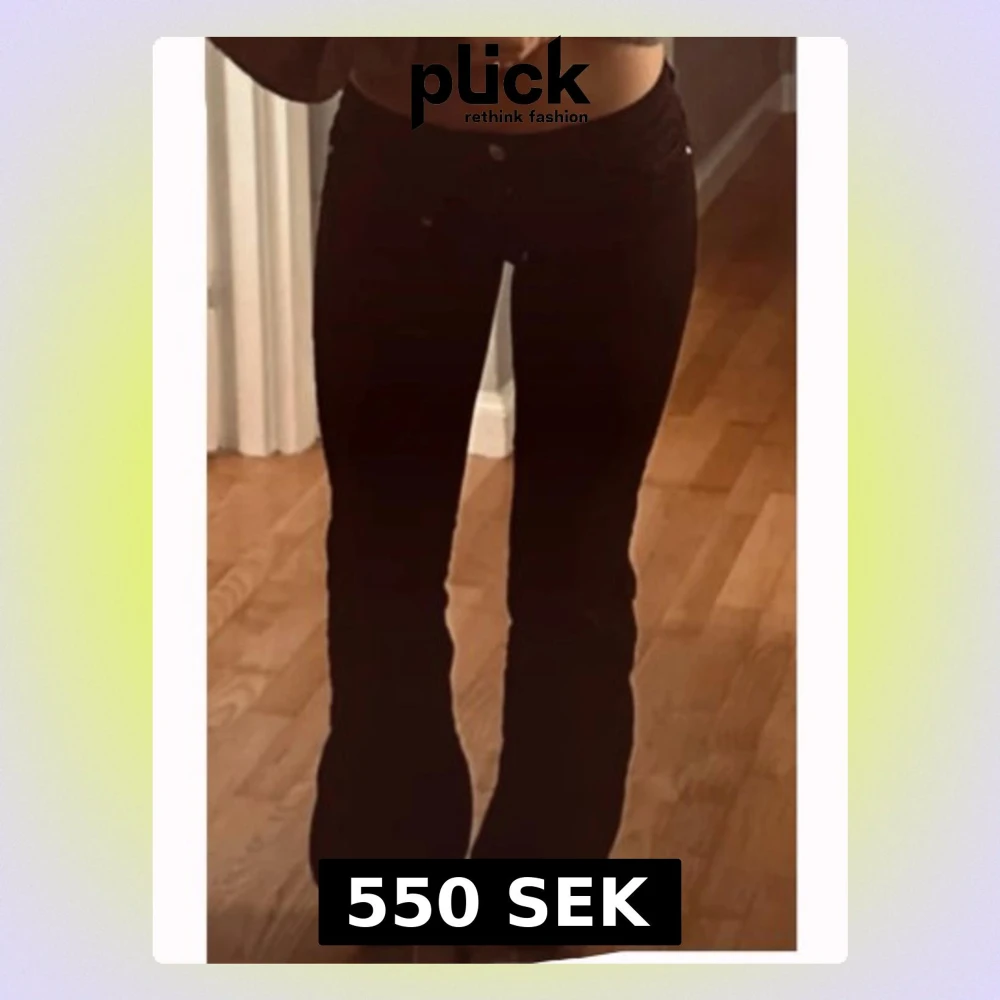 Säljer ett par svarta jeans med bootcut-modell och låg midja. Byxorna har klassisk femficksdesign och är tillverkade i ett stretchigt jeansmaterial som sitter snyggt över höfterna och låren innan de släpper ut vid bensluten.