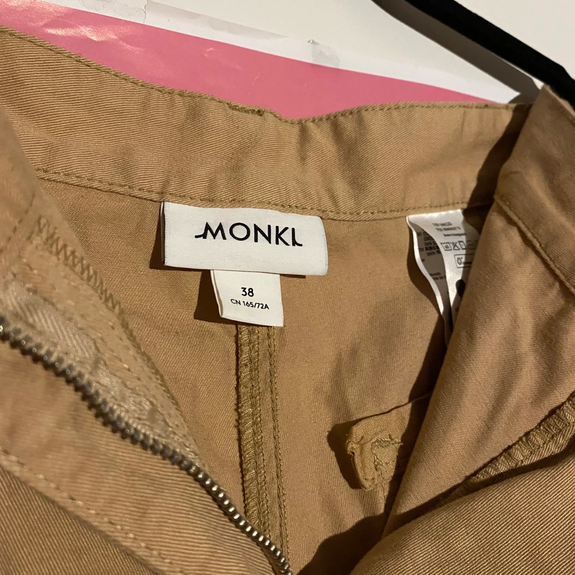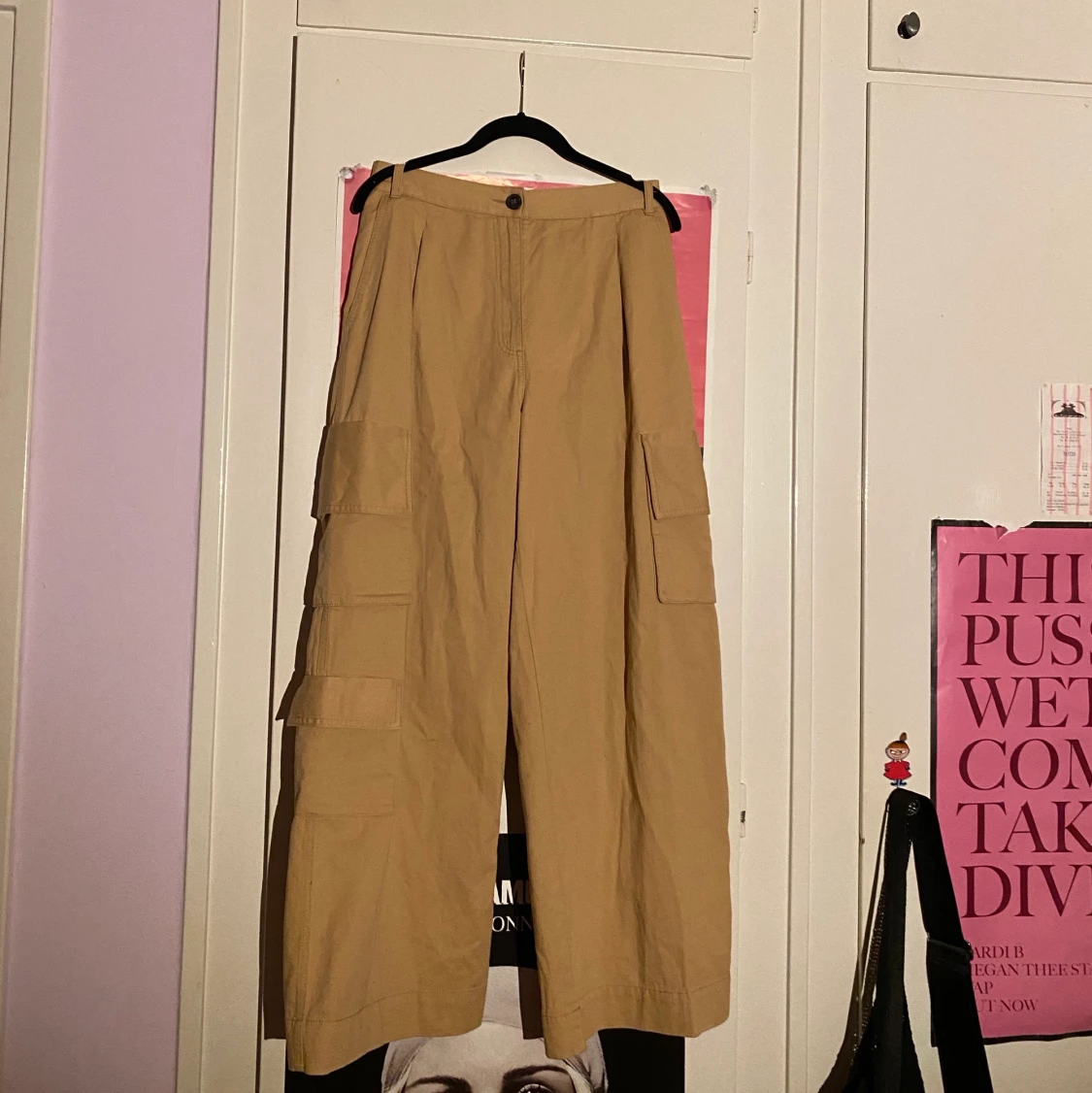 Beigea cargo pants från monki. Köpta second hand men har bara använt de en gång då de är för stora för mig:( Väldigt vida och har totalt tre fickor på benen. Kan skicka fler bilder.