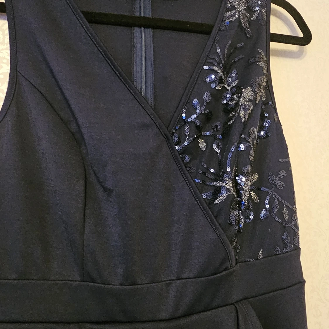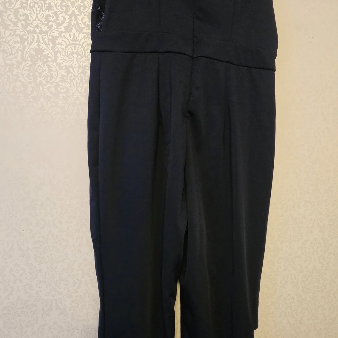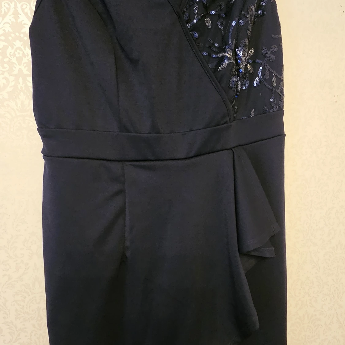 Snygg mörkblå byxdress från SHEIN Curve i storlek 0XL. Byxdressen har omlott-ringning, paljettbroderade detaljer upptill och dragkedja i ryggen. Materialet är mjukt och följsamt, perfekt för dig som vill sticka ut med lite extra glitter.