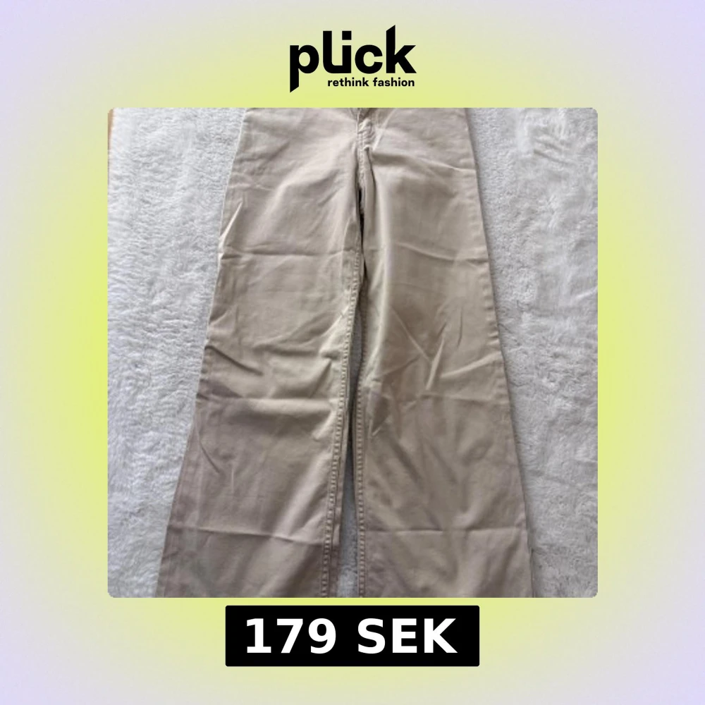Säljer ett par beiga byxor med breda ben och hög midja. Byxorna är tillverkade i mjuk bomull och har klassiska bakfickor. Perfekta för en chill och stilren look.