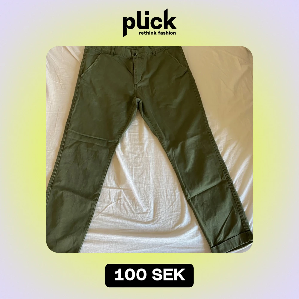 Säljer ett par gröna byxor från Dr. Denim i storlek 33/34. De är i mycket bra skick och gjorda av 100% bomull. Perfekta för höst och vår med en normal passform och stilren design. Byxorna har knappar och dragkedja framtill samt fickor både fram och bak. Liten ljus fläck på ena benet som evt går bort i tvätten.