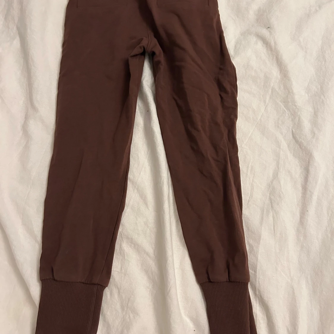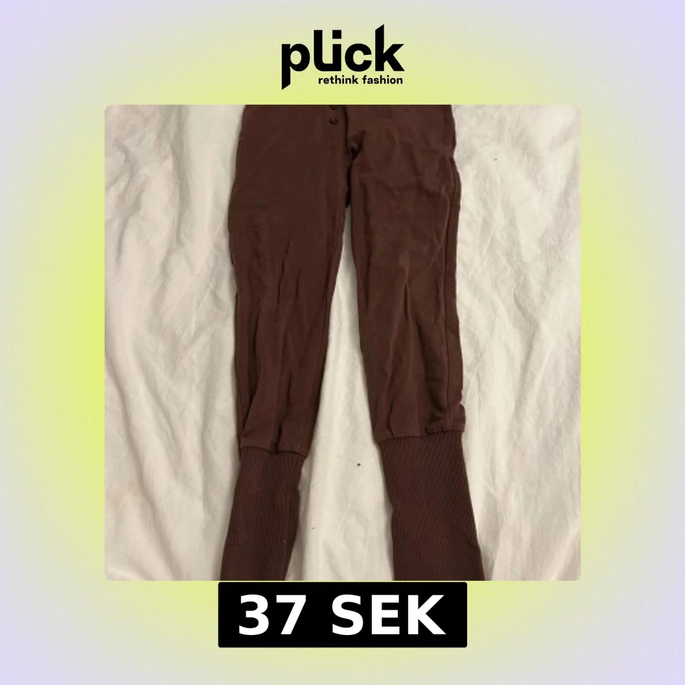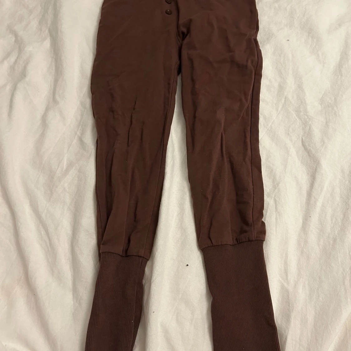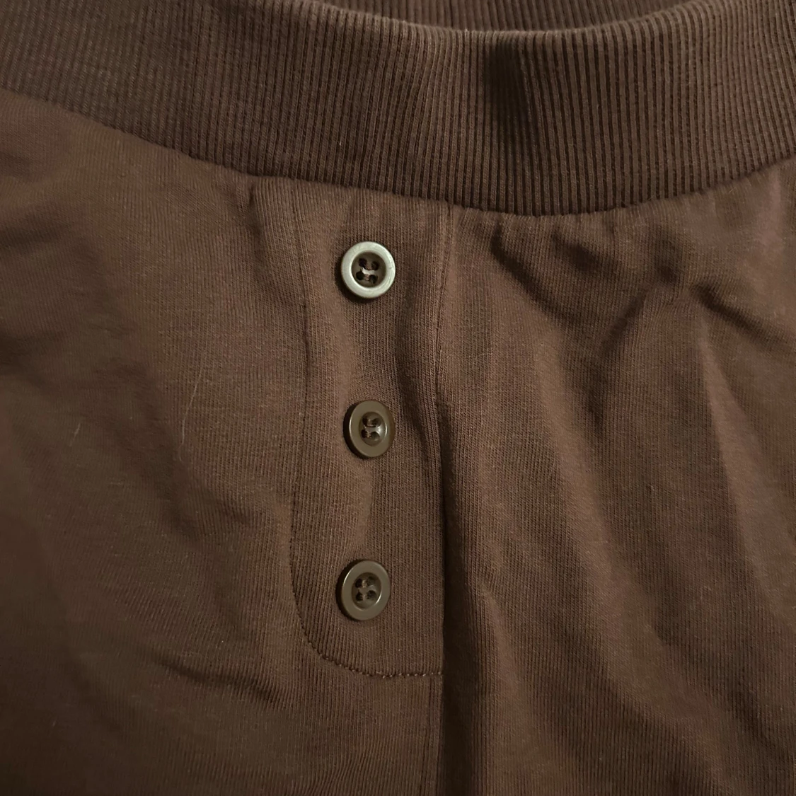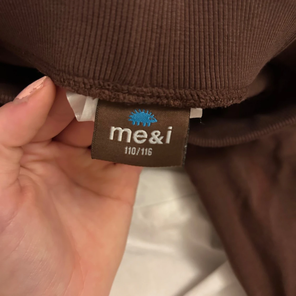Säljer ett par bruna byxor från me&i i storlek 110/116. Byxorna har en bekväm ribbad midja och muddar vid bensluten. De är dekorerade med tre knappar framtill för en extra touch. De kommer tvättas och strykas innan de skickas! ⭐️