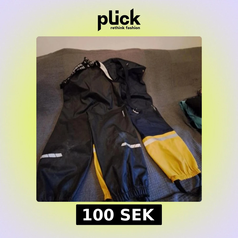 Säljer ett par gula täckbyxor med elastiska muddar och reflexdetaljer. Perfekta för utomhusaktiviteter i kallt väder. Byxorna har justerbara hängslen för bättre passform.