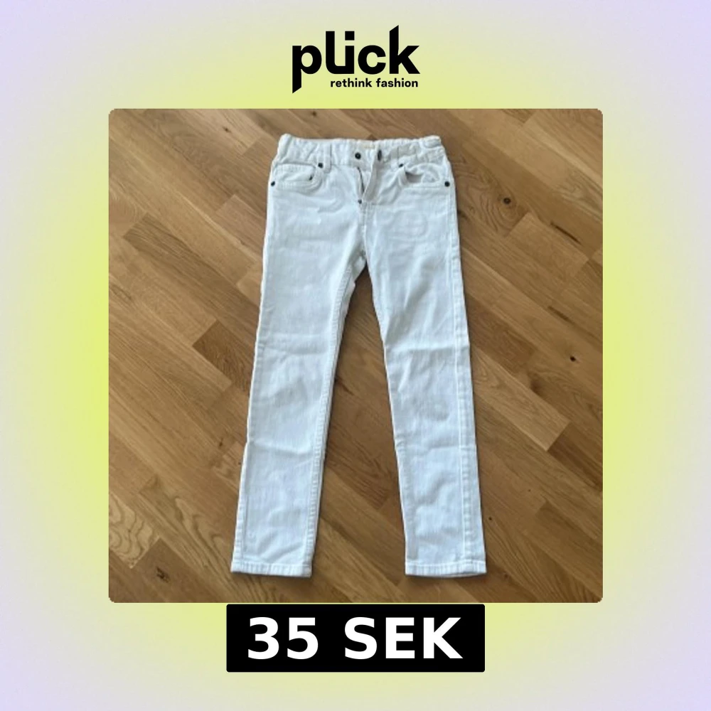 Snygga och moderna vita jeansbyxor från Holly & Whyte by Lindex i storlek 128. Klassisk femficksmodell med raka ben och normal passform. Perfekta till en fräsch och clean look. Materialet är mjukt och bekvämt bomullstyg.finns lite fläckar där och där men jag skulle ändå säga att jeansen är i ett rätt så bra skick eftersom fläckarna knappt syns☺️