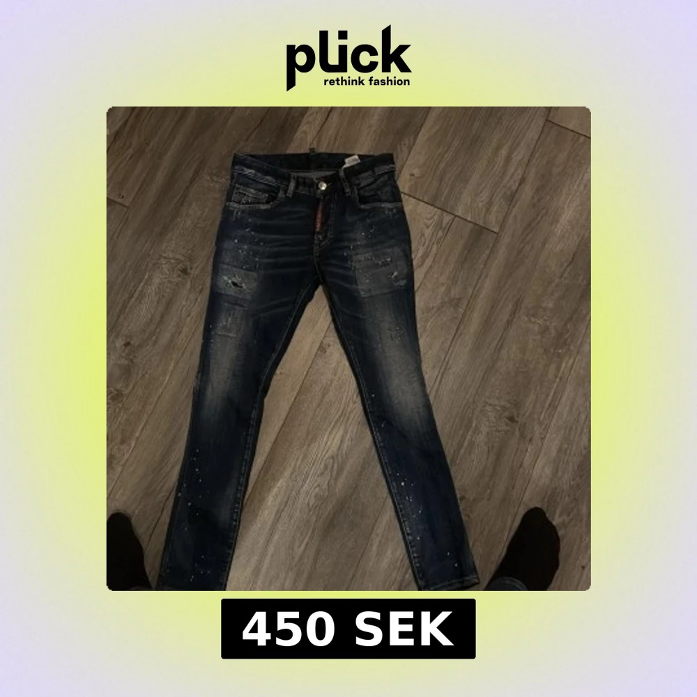 Säljer ett par mörkblå jeans från Dsquared2 med slitna detaljer och färgstänk. Jeansen har normal passform, klassisk femficksdesign och knappgylf. Märkeslogga syns vid gylfen. Perfekta för en trendig streetstil.
