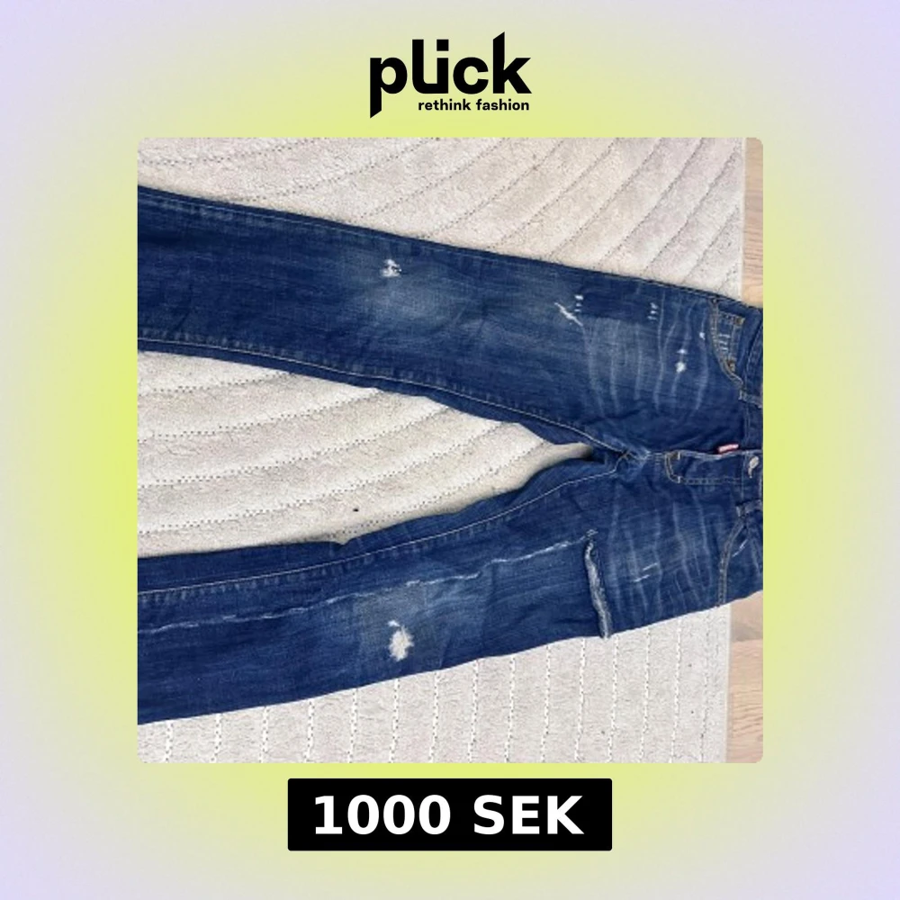 Säljer ett par blå jeans från Dsquared2 med coola slitningar och distressed detaljer. Klassisk femficksmodell med knappgylf och tydliga slitmärken på benen för en avslappnad streetstyle-look.