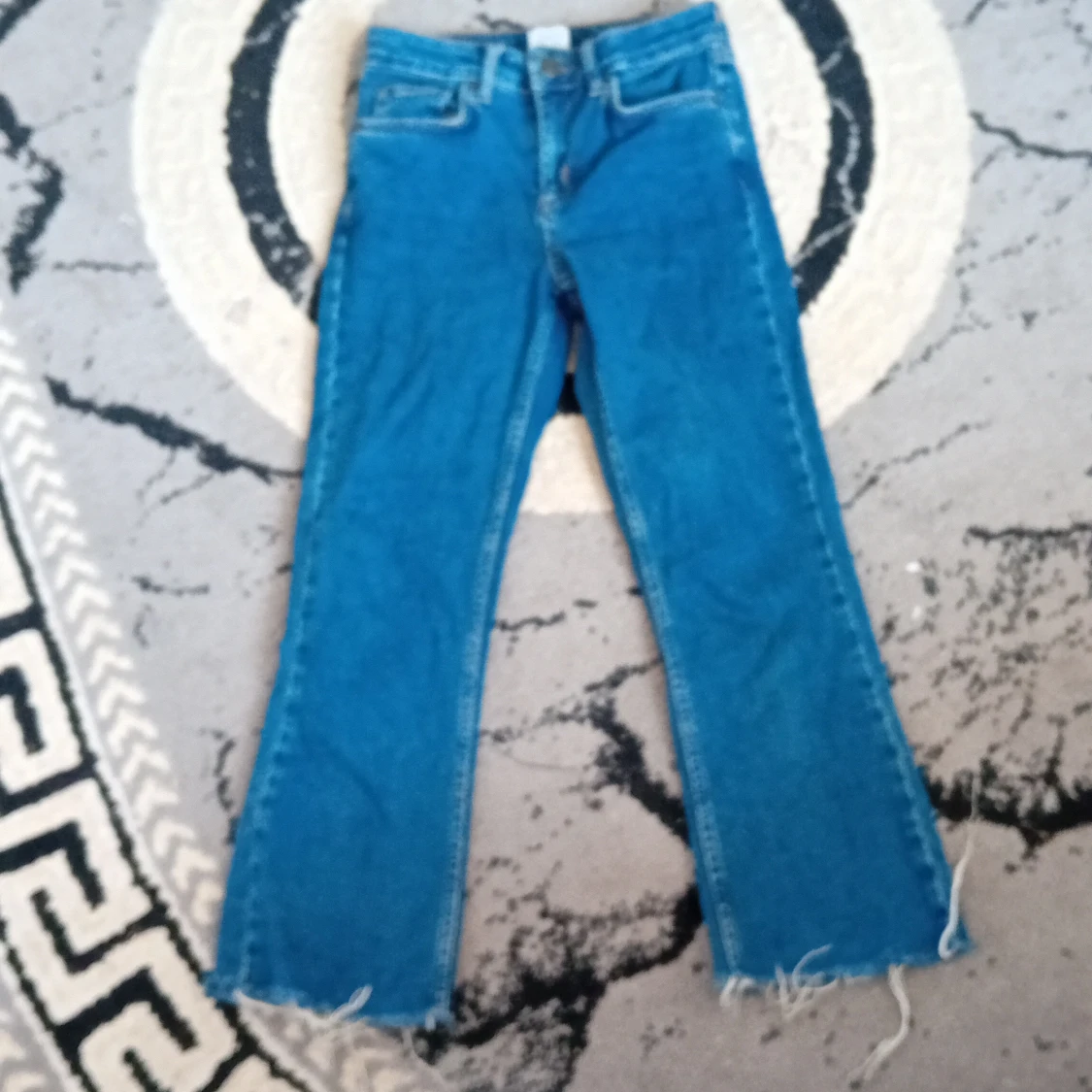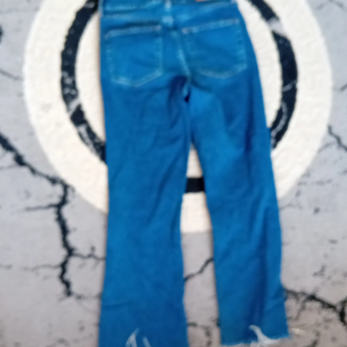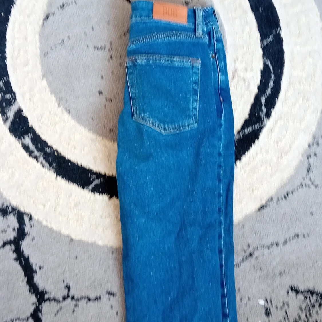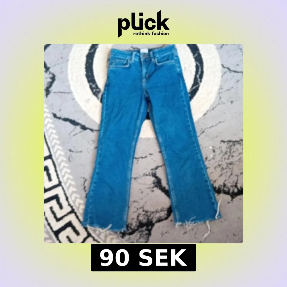 Säljer ett par klassiska blå Levi's jeans med raka ben och råa, fransiga benslut för en cool och avslappnad vibe. Jeansen har fem fickor och en läderpatch bak i midjan. Perfekta för dig som gillar en lite edgy stil.