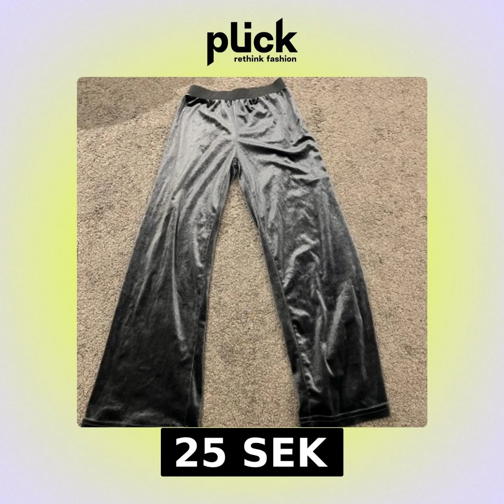 Säljer ett par grå mjukisbyxor och tröja i glansig sammetsmaterial med bred resår i midjan. Byxorna har en loose passform och raka ben, perfekta för chill dagar. Materialet är mjukt och har en snygg lyster som ger en lyxig vibe.