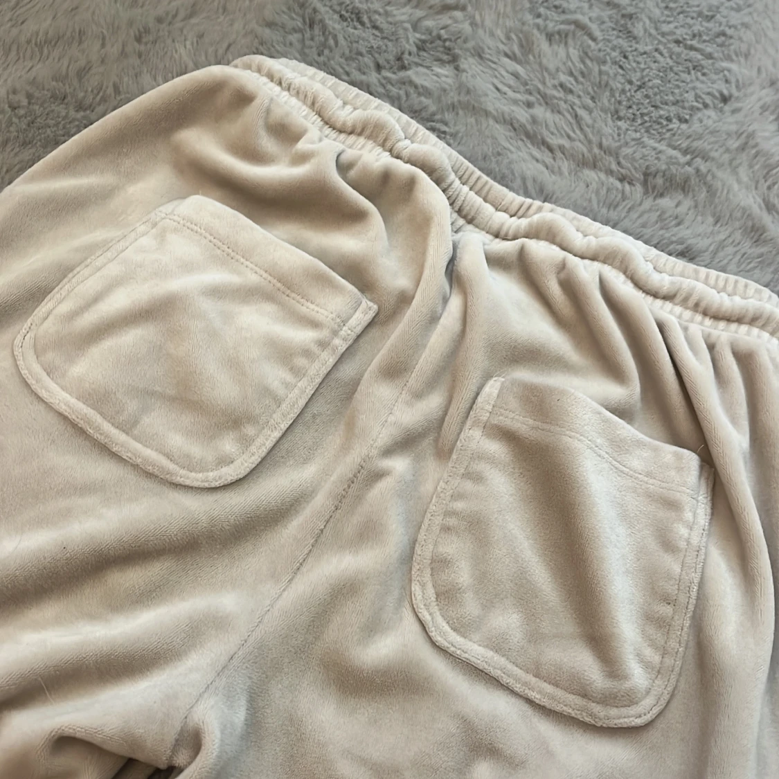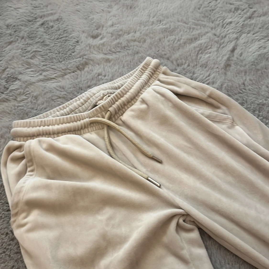Supermjuka beiga mjukisbyxor i velour från C&A Studio. Byxorna har resår och snörning i midjan, två sidofickor fram och två bakfickor. Perfekta för chill dagar och riktigt sköna att ha på sig.