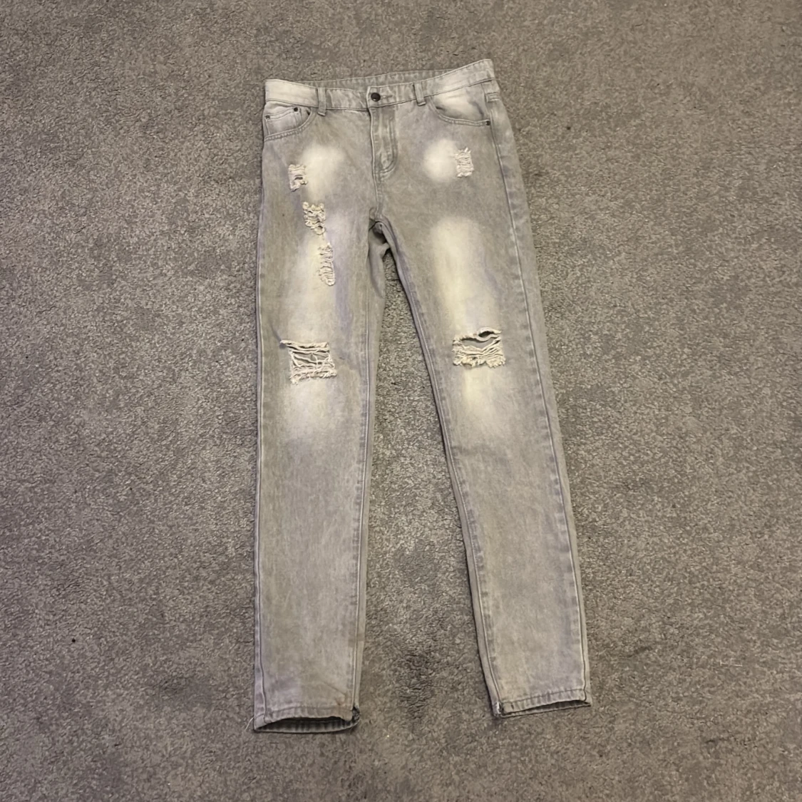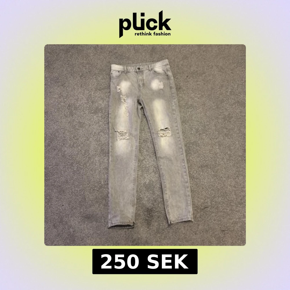 Snygga grå jeans med slitningar och trasiga detaljer på framsidan. Skinny fit och klassisk femficksmodell. Materialet är 85% bomull och 15% polyester, vilket gör dem både mjuka och hållbara. Perfekt för dig som gillar en cool och avslappnad stil.