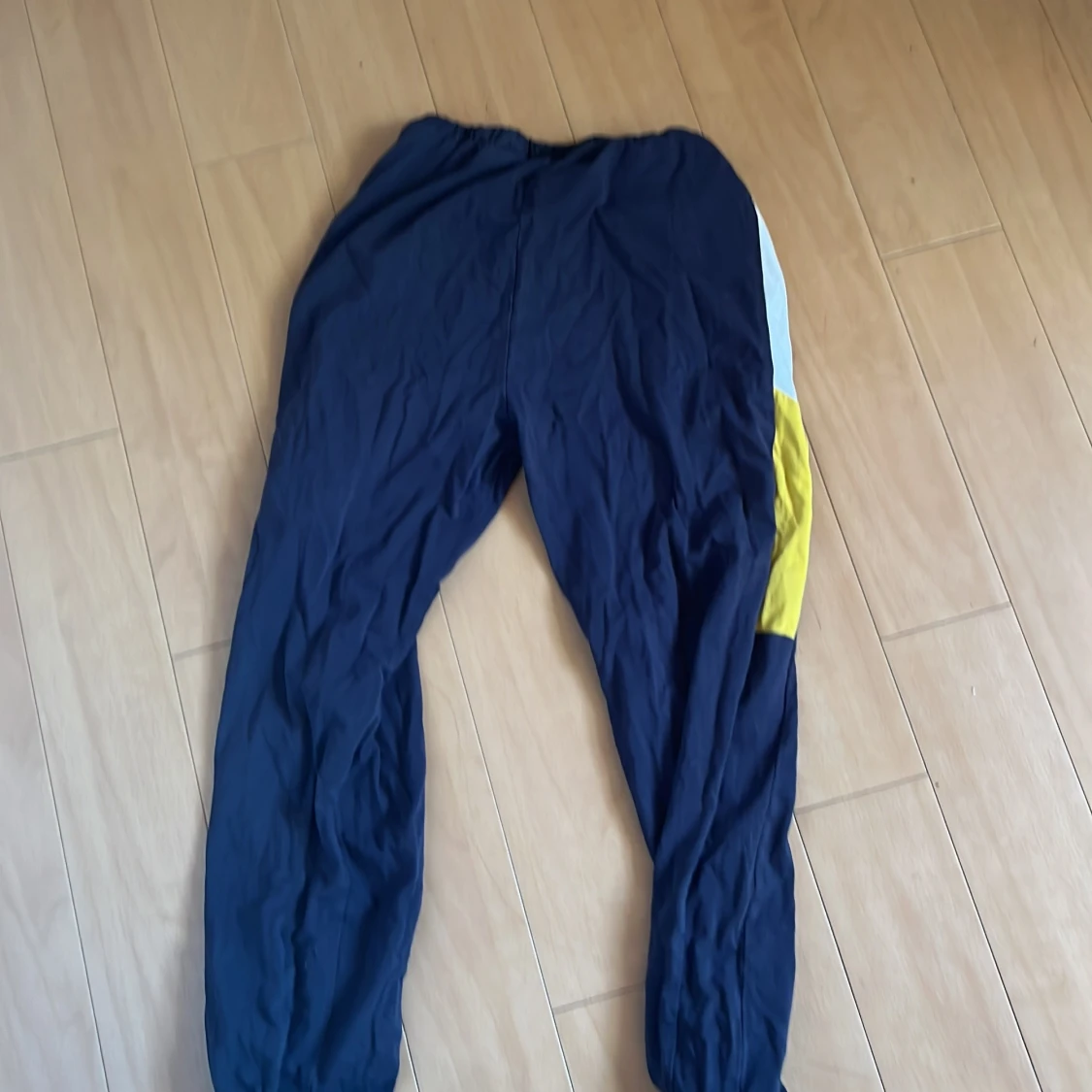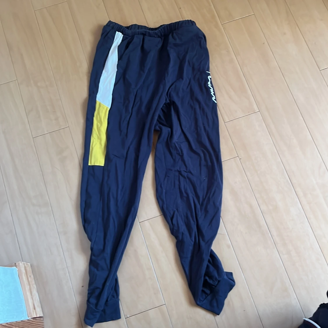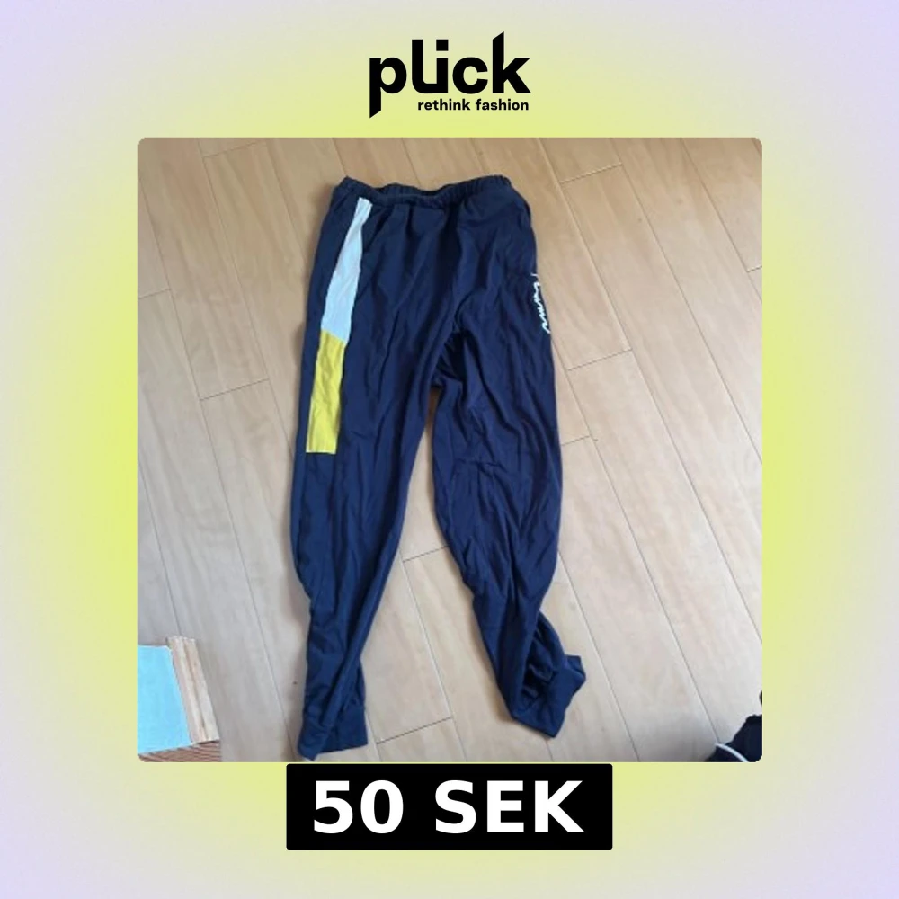 Säljer ett par blå mjukisbyxor från SHEIN med coola färgblock i vitt och gult på ena benet. Byxorna har elastisk midja och en avslappnad passform, perfekta för chill dagar eller träning. Materialet är mjukt och skönt mot huden.