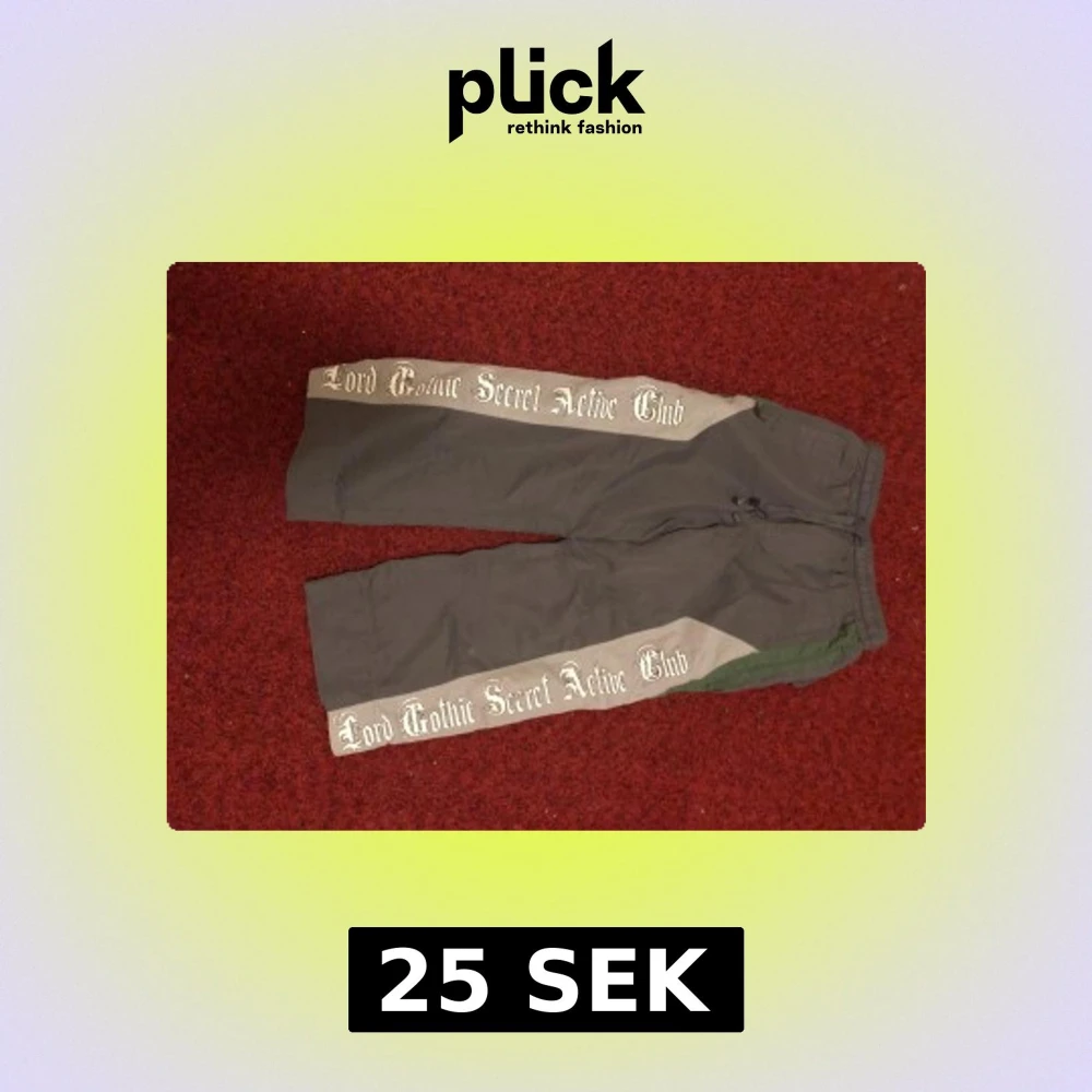 Grå byxor från SAYSKY med breda ljusgrå paneler längs benen och texten 'Lord Gothic Secret Active Club' i gotisk stil. Byxorna har elastisk midja med snörning och en grön detalj vid linningen. Perfekta för dig som gillar streetwear med unik touch.