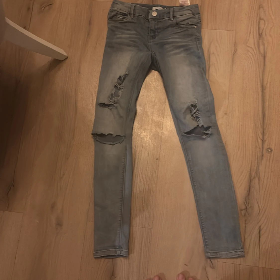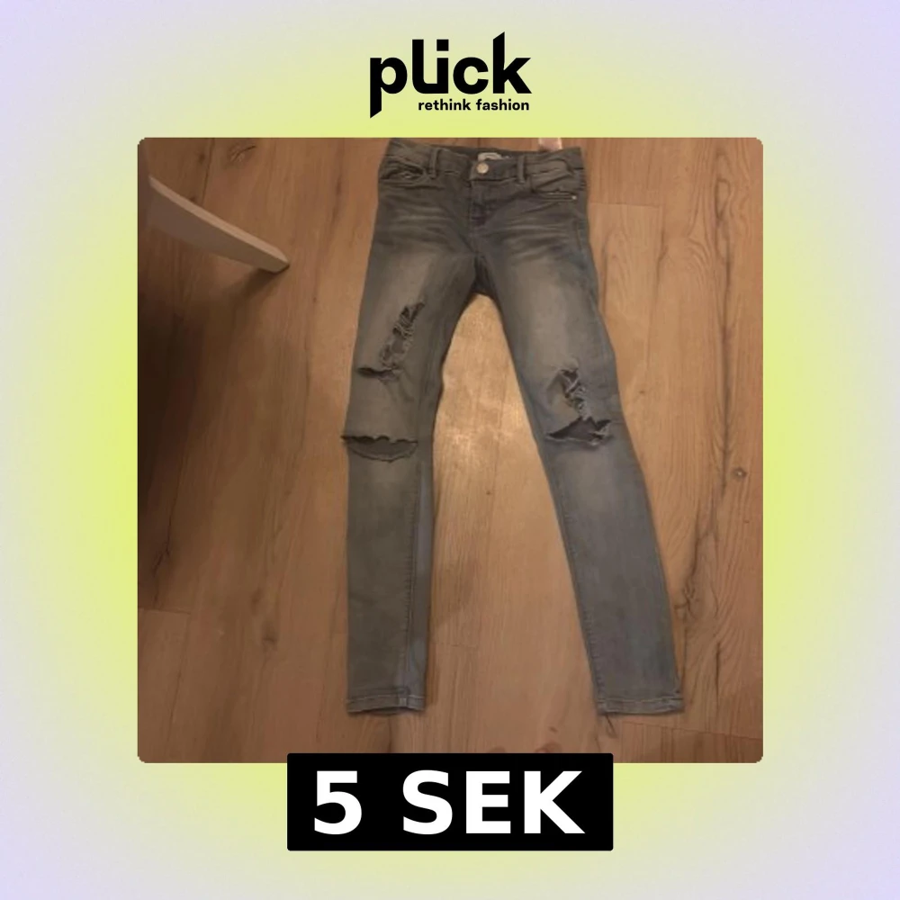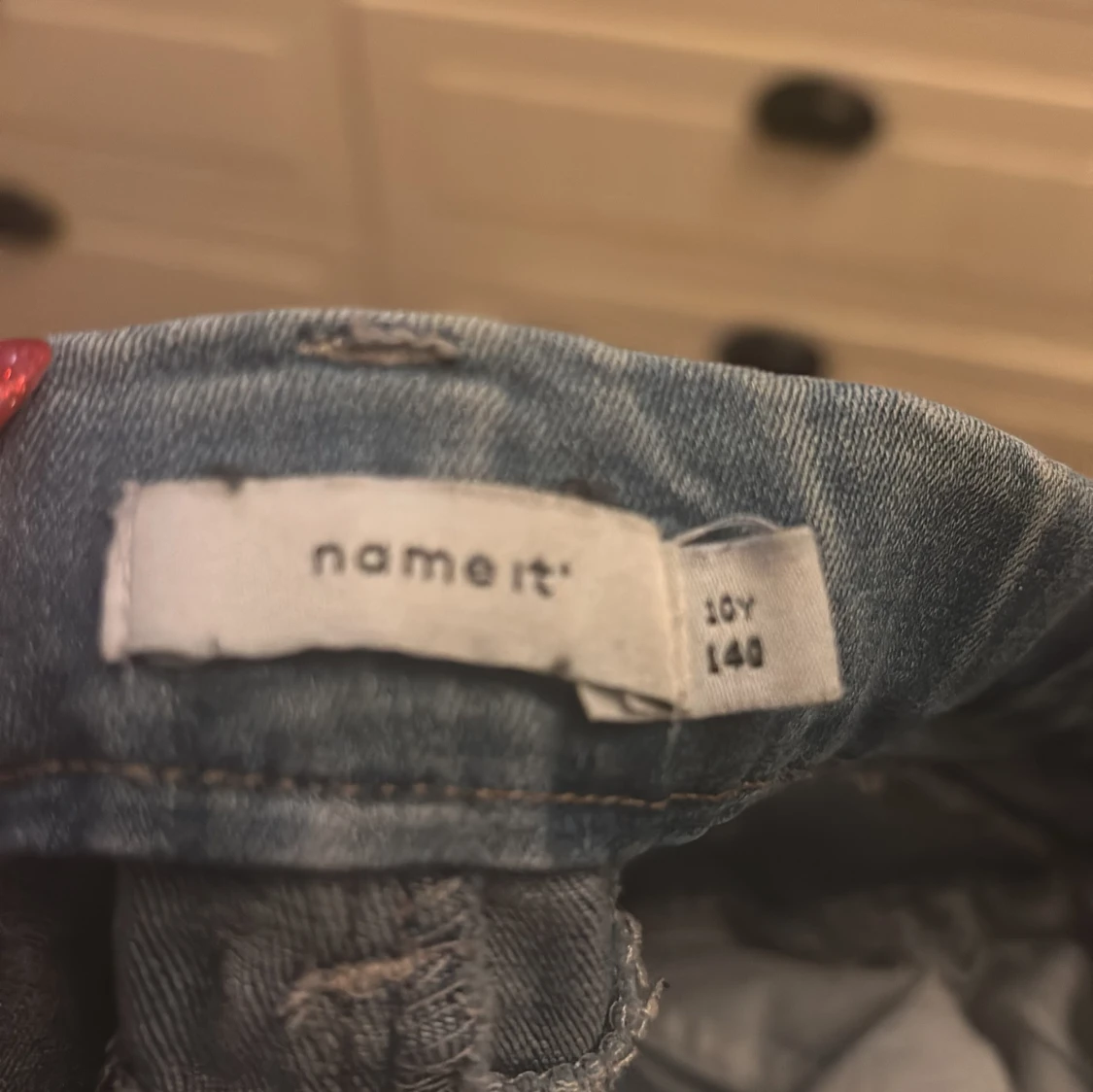Säljer ett par blå jeans från Name It med slitna detaljer på knäna. De har en skinny passform och är perfekta för en avslappnad stil. Jeansen har klassisk femficksdesign och knappgylf.