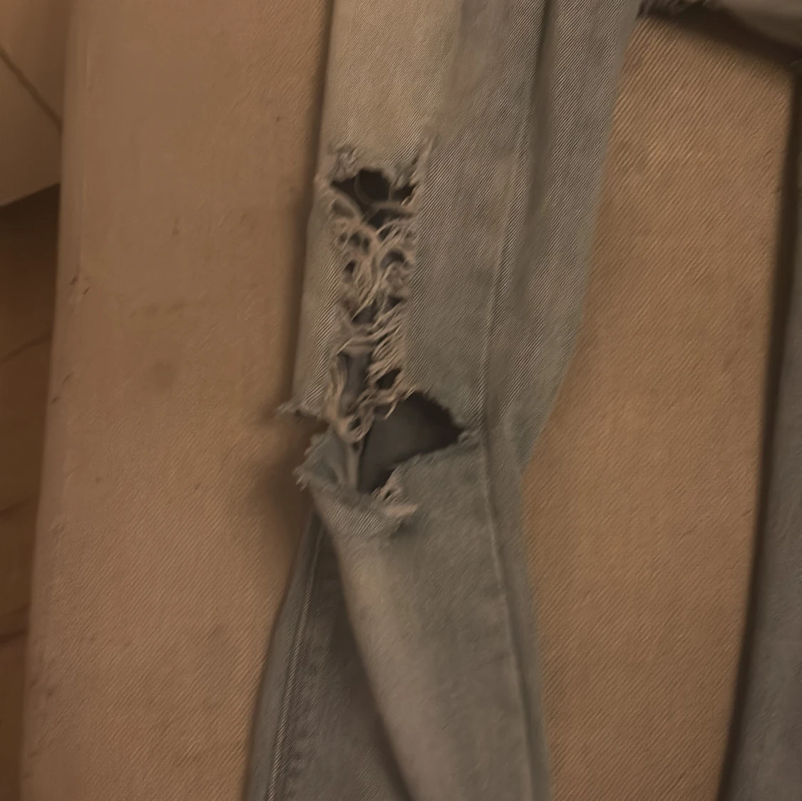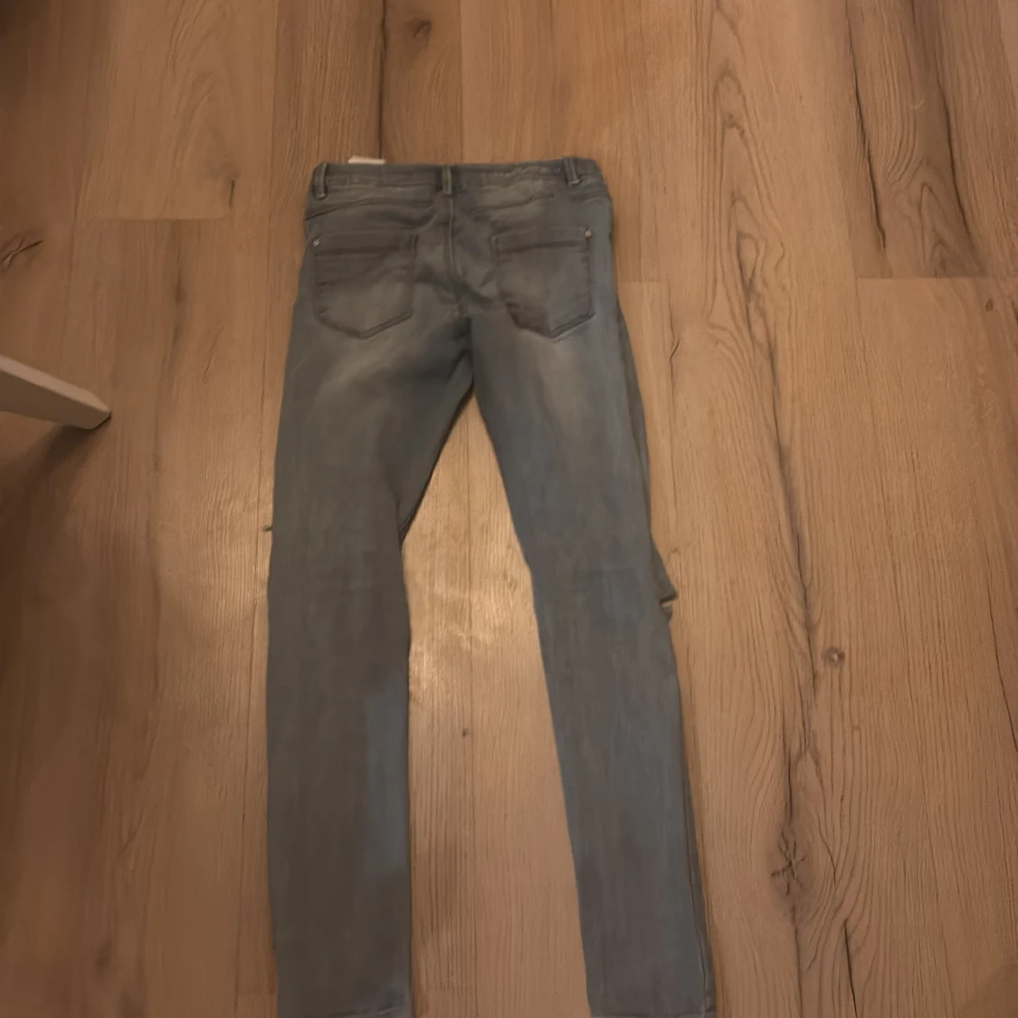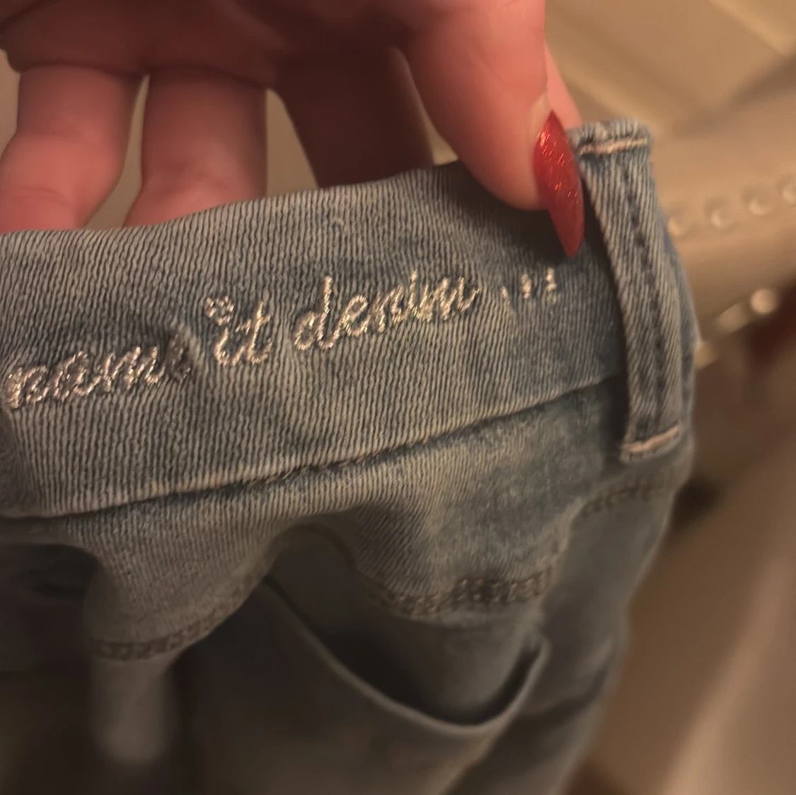 Säljer ett par blå jeans från Name It med slitna detaljer på knäna. De har en skinny passform och är perfekta för en avslappnad stil. Jeansen har klassisk femficksdesign och knappgylf.