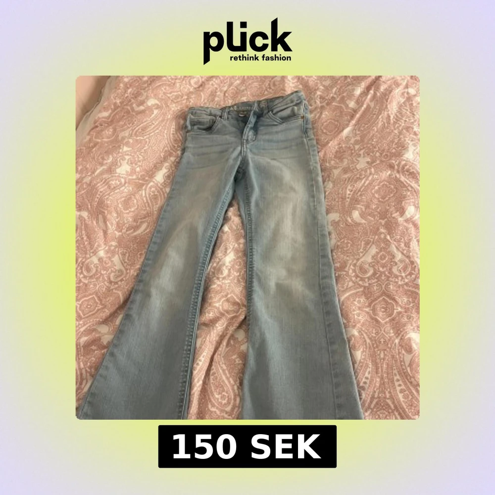 Snygga ljusblå jeans från Kappahl med bootcut-stil. De har en klassisk femficksdesign och är tillverkade i hållbart denim. Perfekta för en avslappnad look. Går att diskutera pris