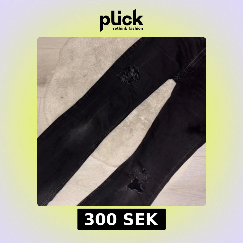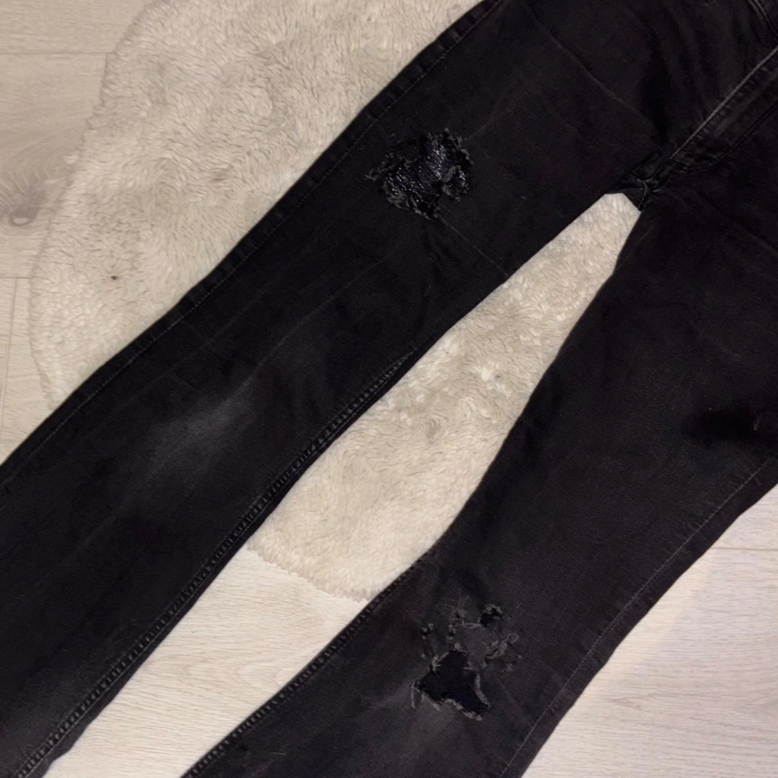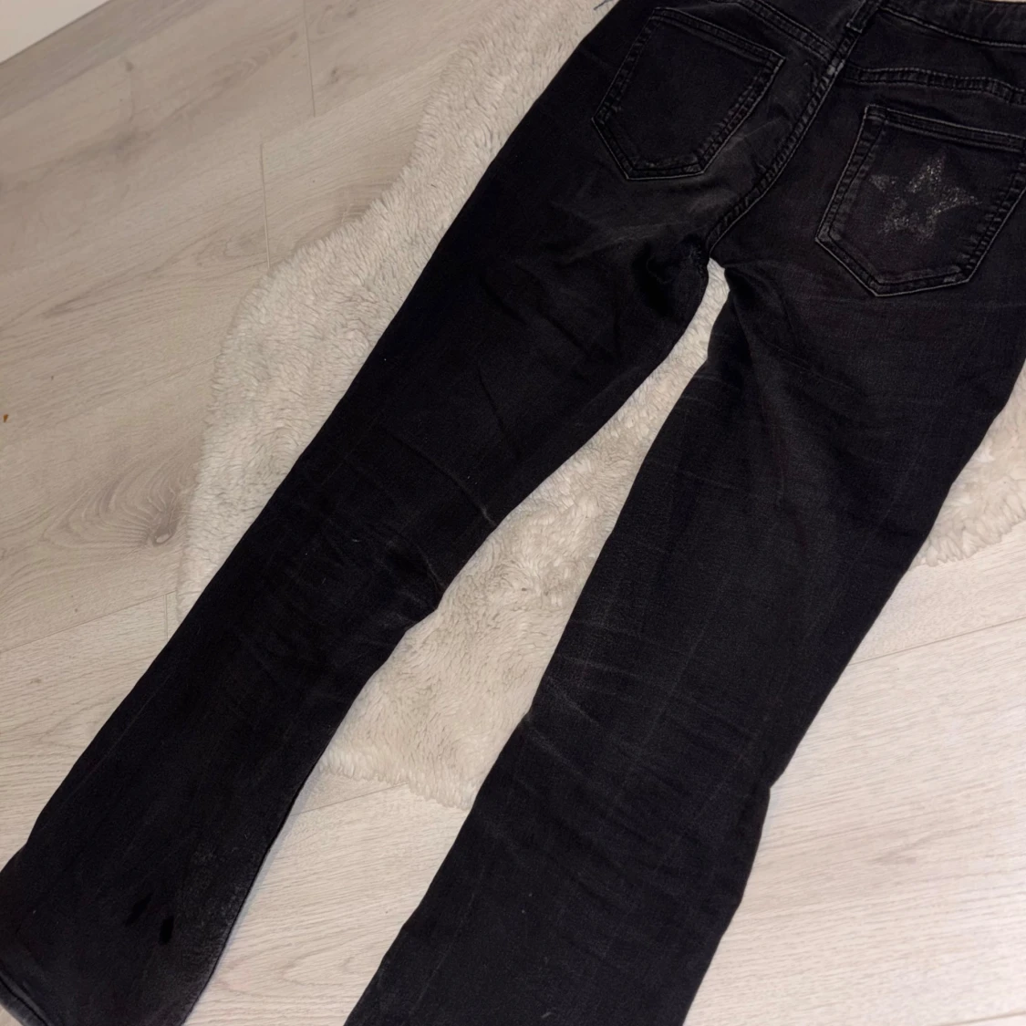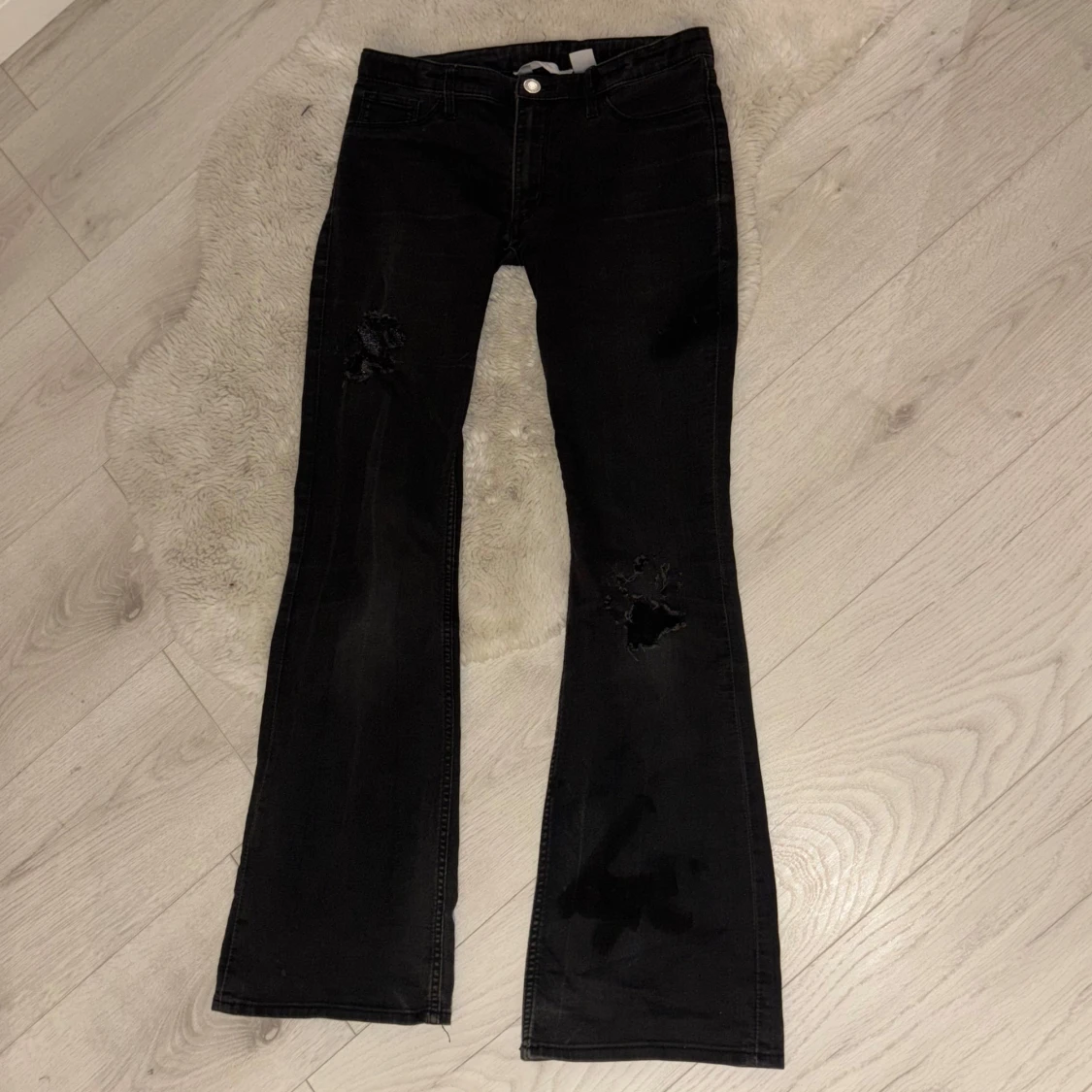 Säljer ett par svarta jeans med bootcut-modell och snygga slitningar på båda benen. Jeansen har klassisk femficksdesign och är tillverkade i stretchigt denimtyg för en bekväm passform. Perfekta för dig som gillar en edgy och avslappnad stil. I ena hålet på knät e det glitter tyg