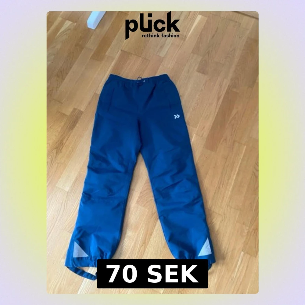 Säljer ett par blå täckbyxor med elastisk midja och snörning. Byxorna har reflexdetaljer vid bensluten och praktiska fothällor. Materialet är slitstark syntet som står emot väta och vind, perfekt för kalla dagar utomhus.