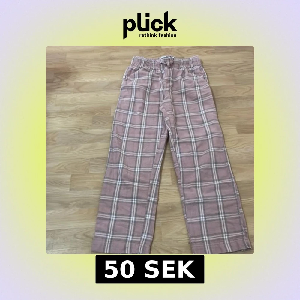 Säljer ett par bekväma rosa byxor med rutigt mönster och resårmidja. Byxorna har en avslappnad passform och är perfekta för en ledig stil. De har även en praktisk snörning i midjan för justerbar passform.