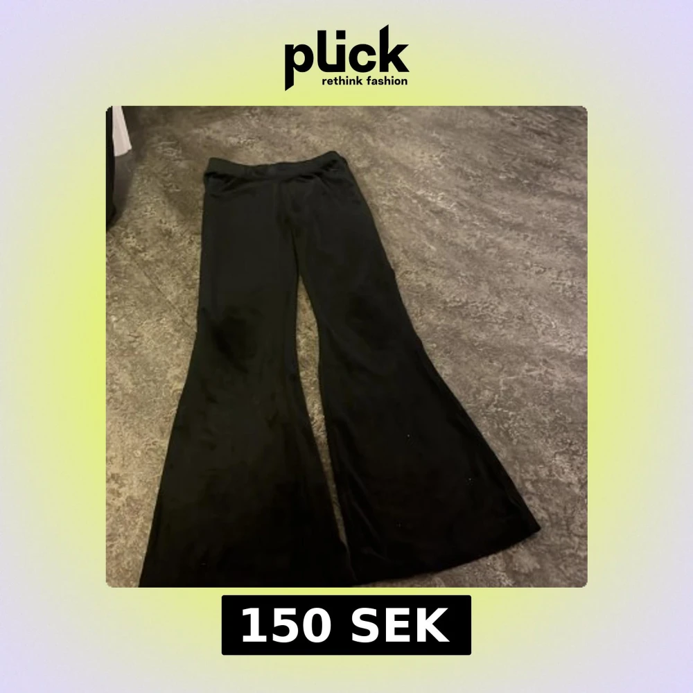 Svarta bootcut byxor från SOC i mjukt och stretchigt material. Byxorna har en bred resår i midjan och en diskret logga framtill. Perfekta för dig som gillar en bekväm och snygg look med utsvängda ben. Dom är inte så stora som de ser ut på bilderna💕 knappt använda. Själv har jag köpt dom för 350kr