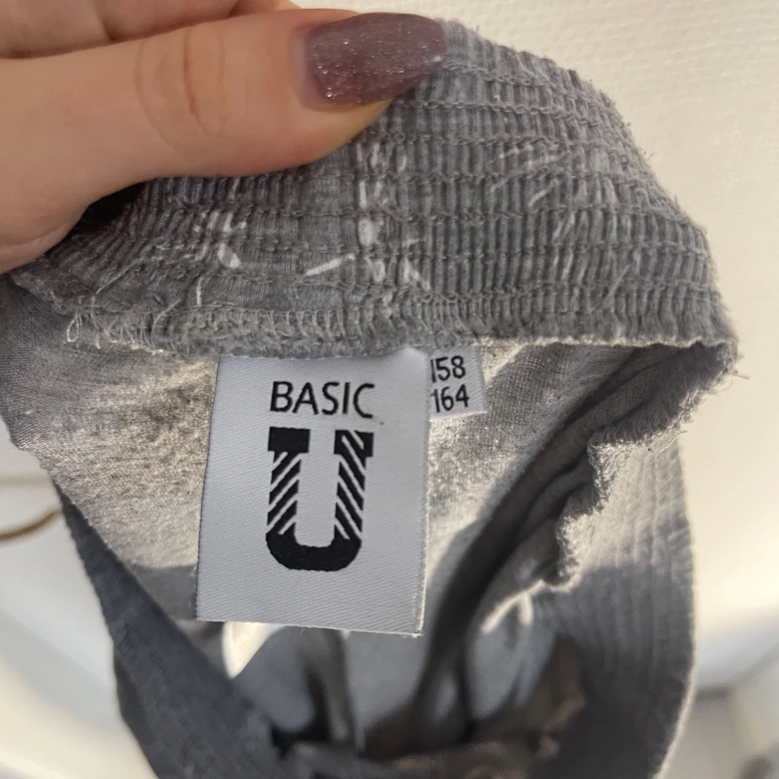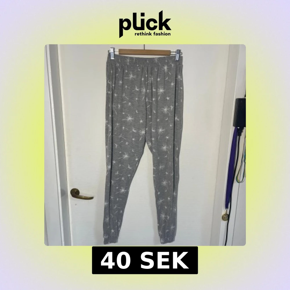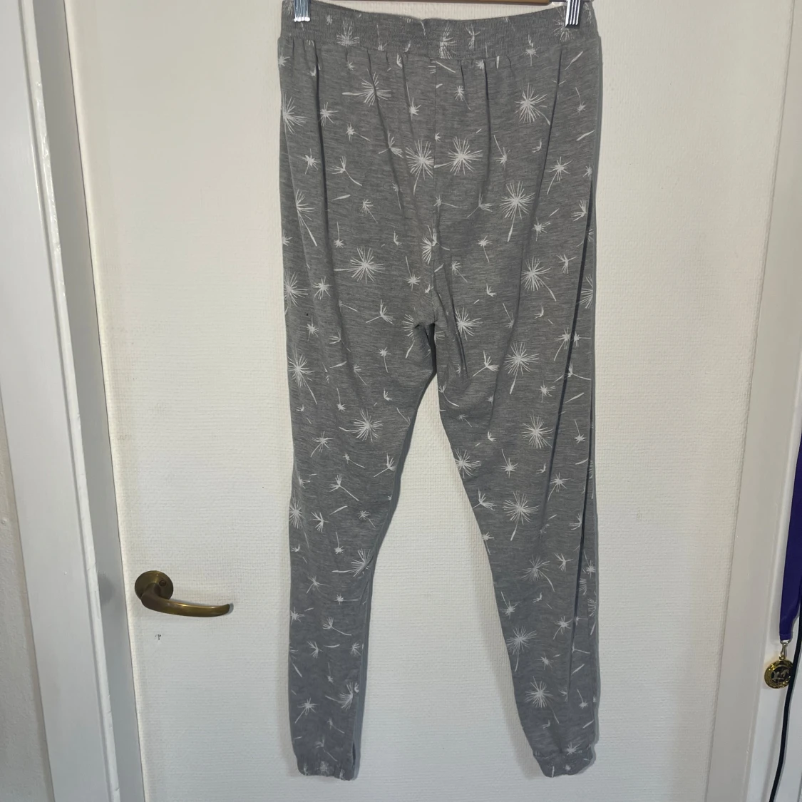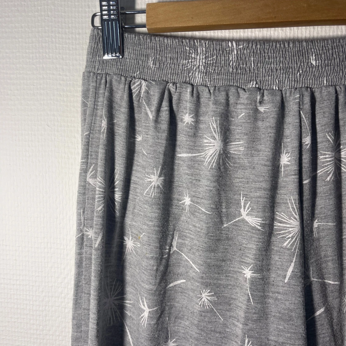 Säljer ett par grå mjukisbyxor från Basic U med ett fint vitt maskrosmönster. Byxorna har en elastisk midja för extra komfort och är perfekta för en avslappnad stil. Något nopprig.